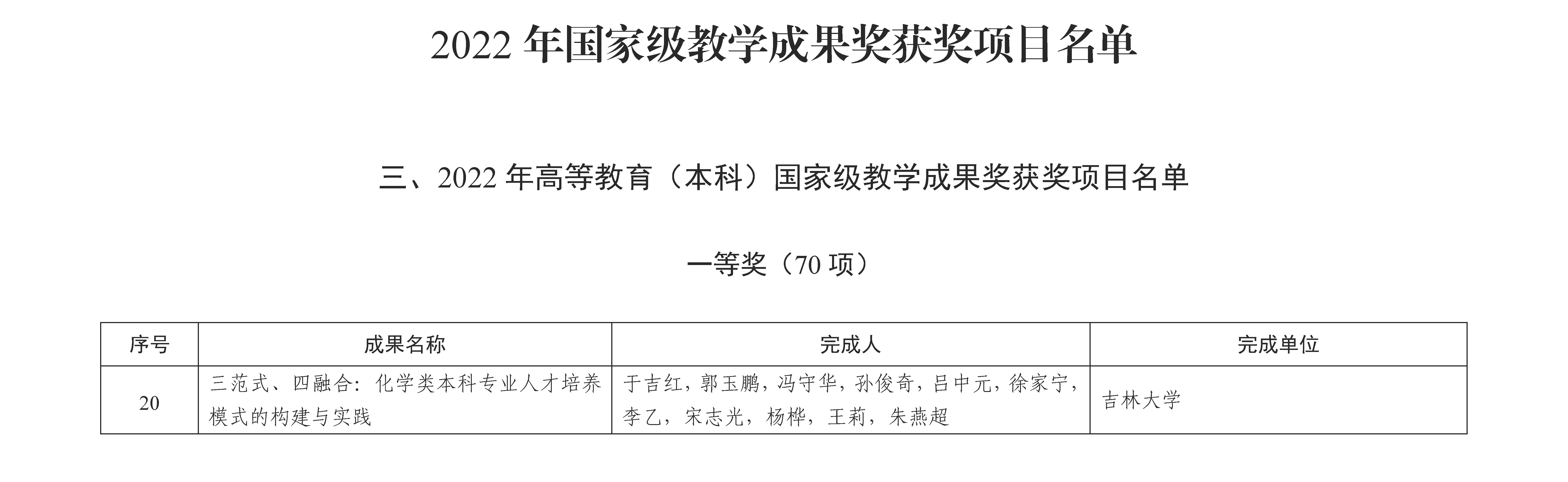 近日,《教育部关于批准2022年国家级教学成果奖获奖项目的决定》(教师〔2023〕4号)公布。EMC易倍官方网站于吉红、郭玉鹏、冯守华、孙俊奇、吕中元、徐家宁、李乙、宋志光、杨桦、王莉、朱燕超完成的《三范式、四融合:化学类本科专业人才培养模式的构建与实践》教学成果,荣获2022年高等教育(本科)国家级教学成果奖一等奖。这是70项2022年高等教育(本科)国家级教学成果奖一等奖中唯一一项化学专业相关的教学成果,也是公司继1993年《物理化学团队建设与人才培养》获国家级优秀教学成果一等奖以来再次荣获国家级教学成果奖一等奖。