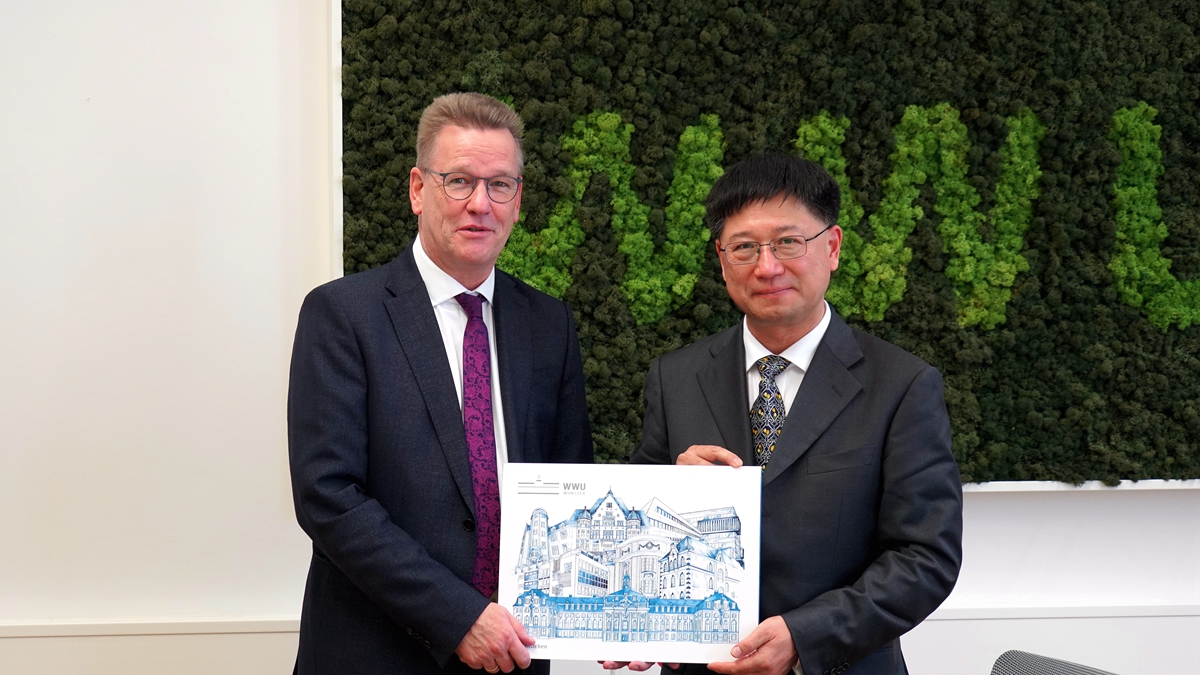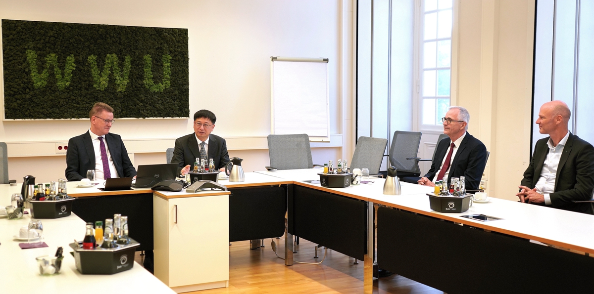 在与明斯特大学董事长约翰内斯•韦塞尔斯(Johannes Wessels)进行会谈时,张希简要回顾了两校学者过去数十年的合作基础,介绍了EMC易倍平台的学科特色与“双一流”建设进展。他指出,EMC易倍平台和明斯特大学都是综合性大学,在化学、物理、数学、生命科学、地学、哲学、法学、医学、人兽共患病等领域具有巨大合作空间。韦塞尔斯向代表团简要介绍了明斯特大学近年来的办学进展,特别是公司的科研重点领域、卓越集群建设情况、创新创业与校企融合进展等,高度肯定两校在化学、物理等领域的务实合作,并对开展更多领域合作做出积极回应。双方就继续组织双边研讨会、推动博士研究生联合培养、共同推进前沿科学探索与交叉融合研究等达成了共识。