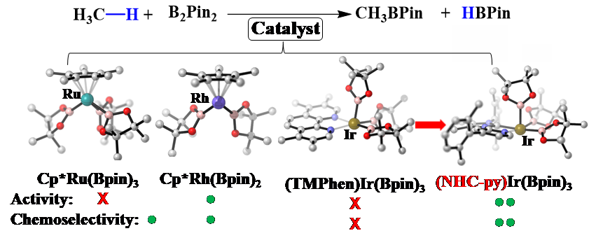 近期,钟荣林博士继续在此领域深入探索,将对机理的研究拓展到在实验上更难实现的甲烷硼化反应,并作为第一作者和通讯作者,以EMC易倍官方网站理论化学研究所为第一通讯单位,在J. Am. Chem. Soc上发表了有关机理研究与催化剂精准设计的工作[3]。该工作主要发现了Ru催化的甲烷硼化过程中的两个中间体都包含较强的H…Bpin成键相互作用,它们中Ru的氧化态是一个介于Ru(IV)和Ru(VI)的特殊中间态。在对催化剂的活性和化学选择性深入理解之后,他们进一步提出了一个二者兼顾的配体设计策略,改善铱催化剂的性能:利用具有非对称结构且强供电子能力的氮杂环卡宾-吡啶配体来增强铱配合物对甲烷的催化活性,同时在合适的位置引入特定的位阻基团来压制溶剂分子的反应并提高催化剂对甲烷硼化的化学选择性。通过对13种配体参与的反应进行详细理论计算,预测了可能表现出更高活性且更高化学选择性的相关催化剂结构,实现了对催化剂结构的精准设计(图2)。