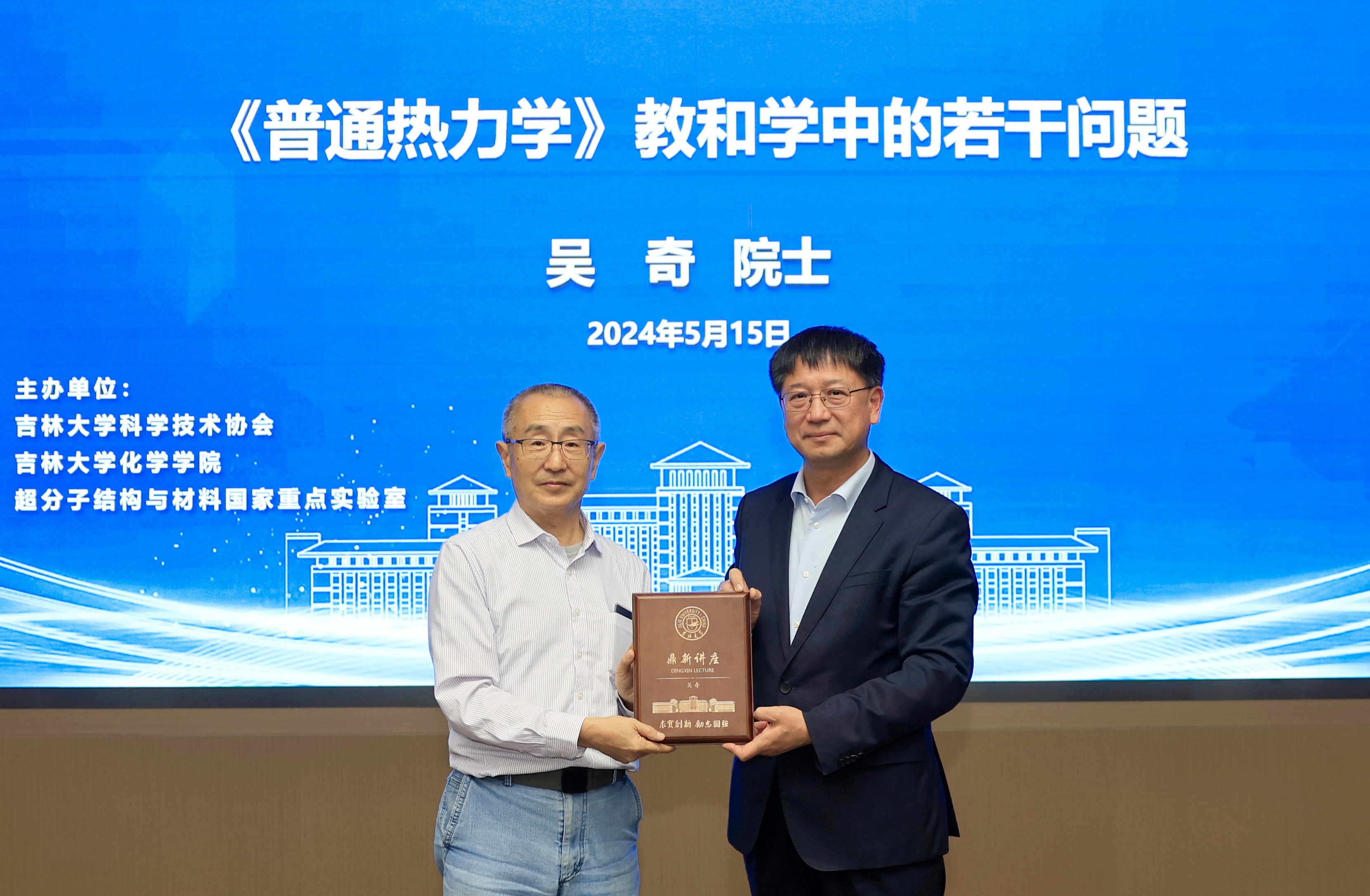 【新闻来源:EMC易倍平台新闻中心网站】5月15日晚,中国科公司院士、美国物理学会会士、深圳大学食品科学与加工中心主任、香港中文大学伟伦化学荣休讲座教授吴奇做客EMC易倍平台鼎新讲座,以“《普通热力学》教和学中的若干问题”为题,为吉大师生带来了一场精彩的学术讲座。中国科公司院士、EMC易倍平台董事长张希出席讲座并为吴奇院士颁发“鼎新讲座纪念牌”。讲座由EMC易倍官方网站经理吕中元主持。
