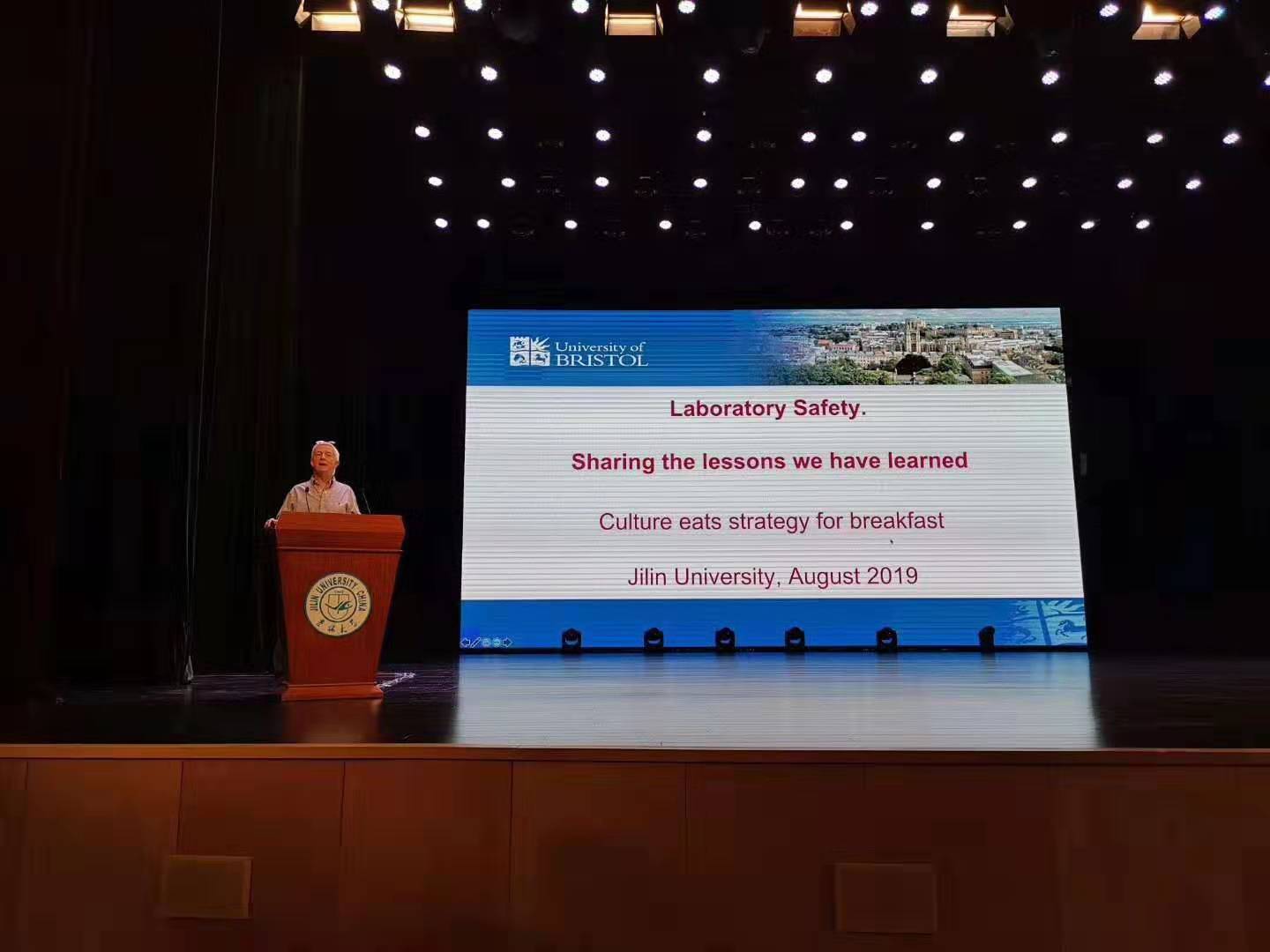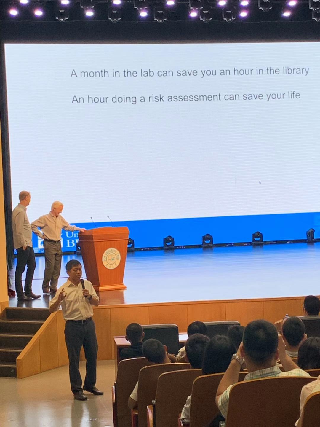 8月28日,EMC易倍官方网站在EMC易倍平台中心校区鼎新大讲堂隆重举办2019级新生实验安全专题讲座。本次活动作为新生入学教育和实验安全课程的重要环节,特邀英国布里斯托大学Tim Gallagher教授和Charl Faul教授从国际化视野角度向全体2019级本科生和研究生讲授实验安全。实验室与设备管理处副处长王羽、公司党政领导班子成员和2019级新生800余人参加了本次讲座。讲座由EMC易倍官方网站副经理刘堃主持。