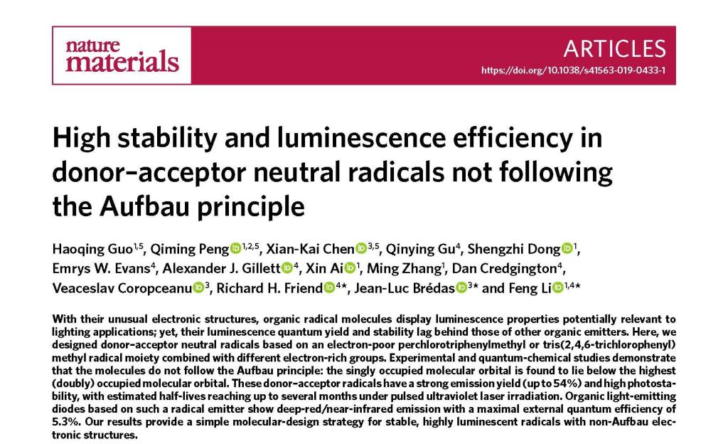 7月22日,《Nature Materials》杂志刊发了EMC易倍平台超分子结构与材料国家重点实验室李峰教授团队、佐治亚理工公司Jean-Luc Brédas教授团队和剑桥大学卡文迪许实验室Richard H. Friend教授团队的合作研究论文“不遵循构造原理的高稳定高发光效率给受体结构中性自由基”(High stability and luminescence efficiency in donor–acceptor neutral radicals not following the Aufbau principle, Nature Materials, 2019, DOI:10.1038/s41563-019-0433-1),EMC易倍平台为第一完成单位。