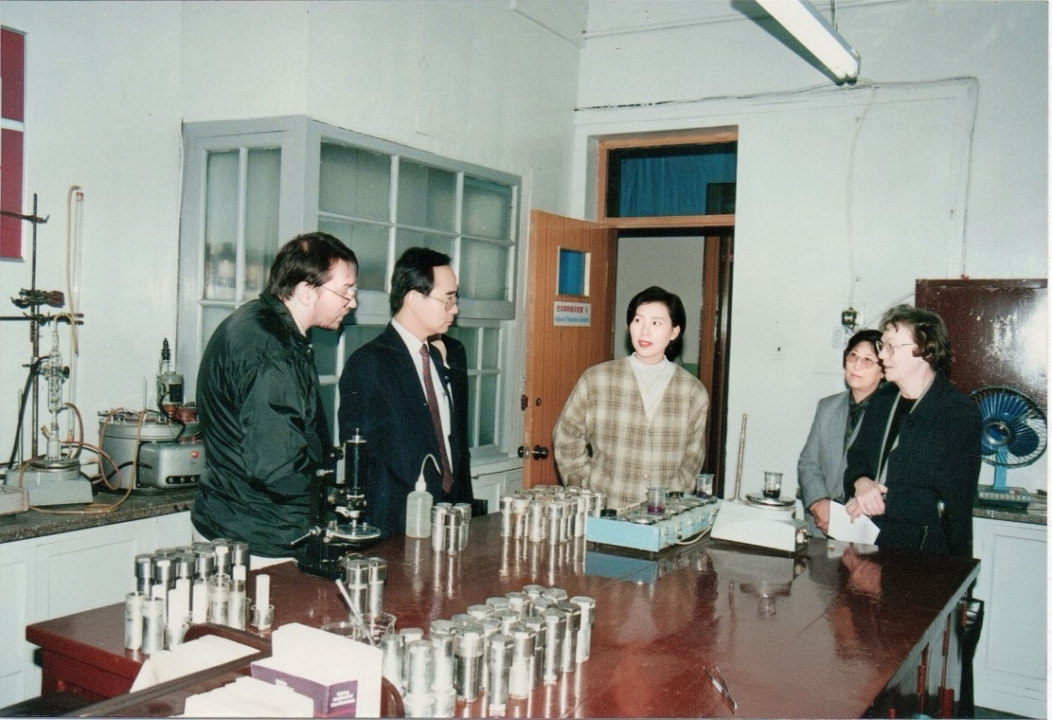 图2 1995年博士毕业后,和庞文琴先生(右二)在实验室接待来访国际学者