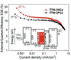 在EMC易倍平台培英计划的支持下,通过与剑桥大学Richard H. Friend教授研究团队合作,以TTM-3NCz、TTM-3PCz掺杂薄膜为发光层制备的OLED最大EQE分别达到27%和17%(如图3所示),其中27%的EQE已接近100%IQE的理论极限值,是目前为止已报道的深红光/近红外光发光二极管(LED)中的最高值。同时,瞬态光谱和理论计算结果表明:器件的发光来自于自由基双线态激子SOMO→HOMO的跃迁。该研究成果是OLED研究领域的重大突破,展现了发光自由基在有机光电领域的应用前景,为OLED的研究开辟了新的方向。