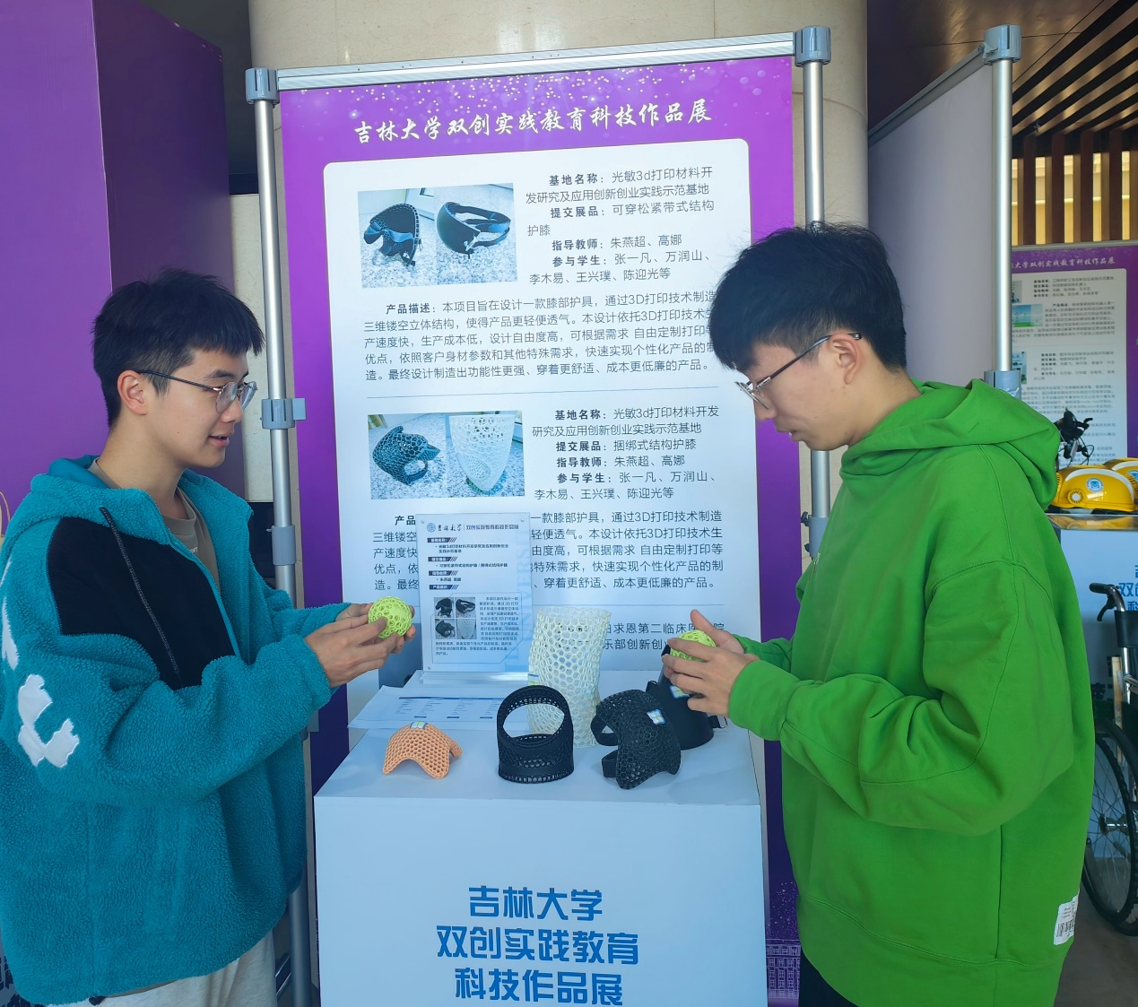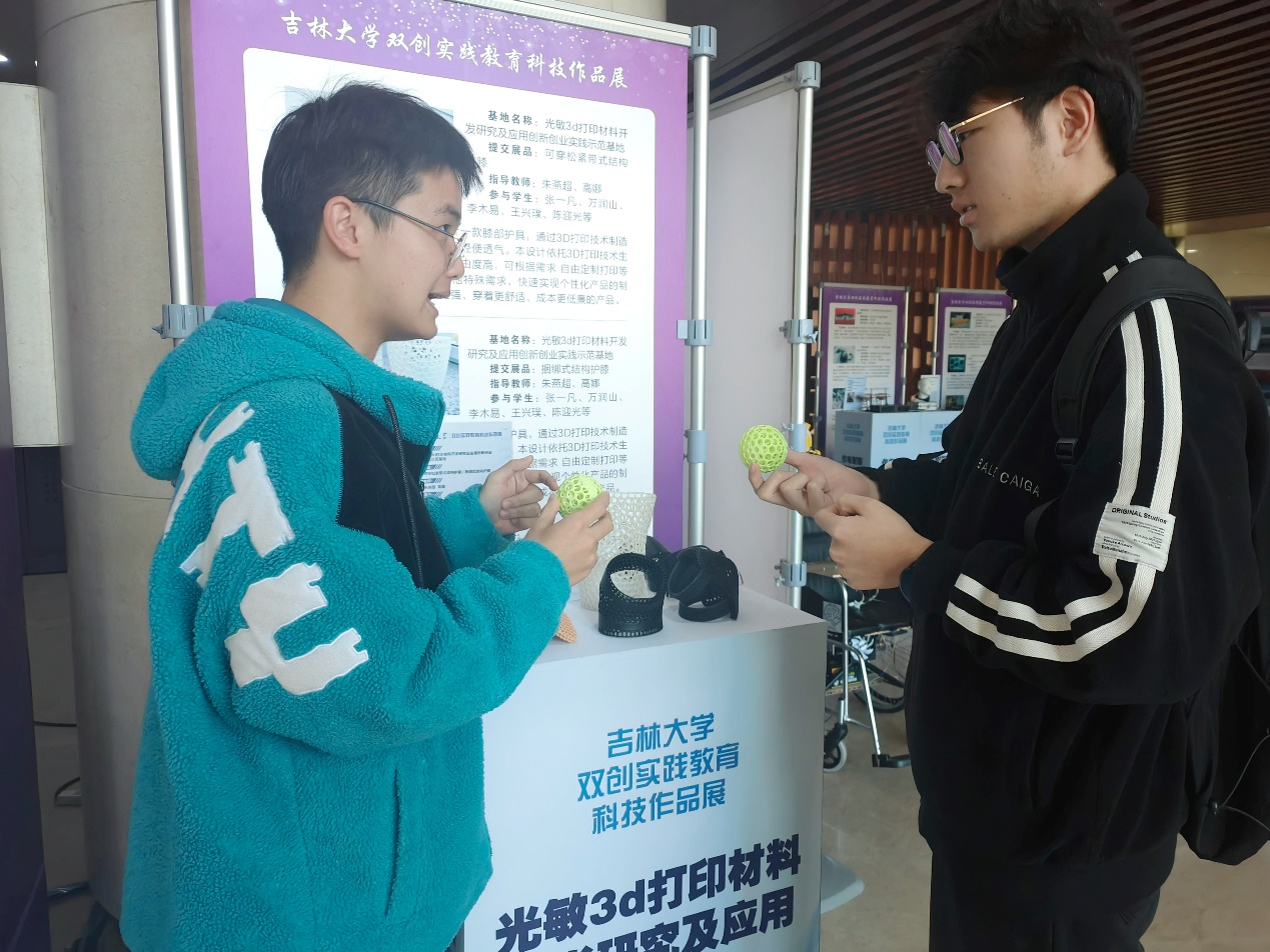 EMC易倍官方网站光敏3d打印材料开发研究及应用创新创业实践示范基地在与苏州博理新材料科技有限公司合作的基础上设计制作的三维立体多孔结构护膝产品参与了本次展会,护膝可用于运动防护以及医疗辅助。2022级化学专业李木易同学为此次参展的讲解员。