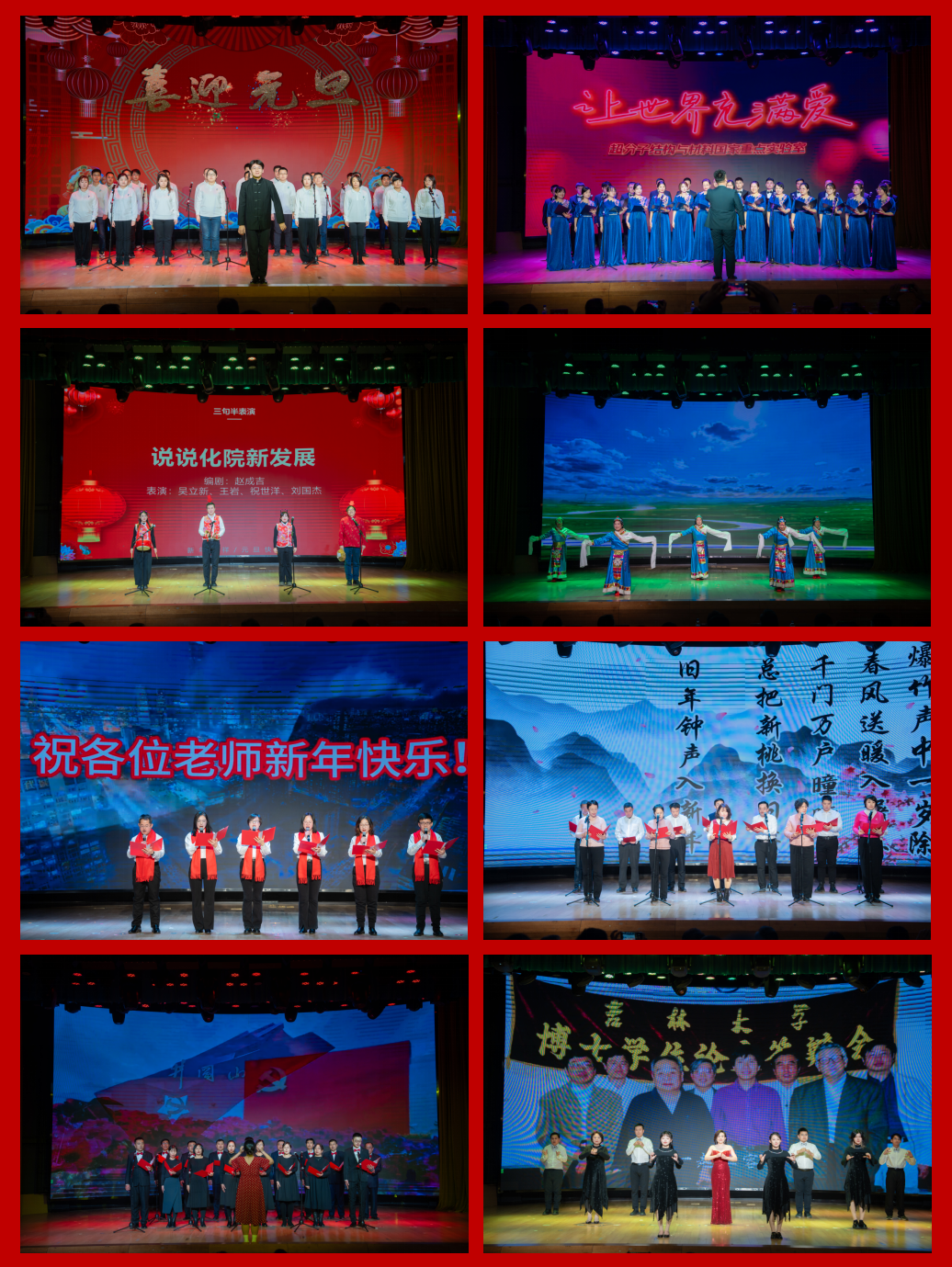 晚会节目形式多样,精彩纷呈。无机合成与制备化学国家重点实验室合唱《团结就是力量》,以激昂的歌声展现了公司师生的团结与坚定信念;特种工程塑料教育部工程研究中心、高分子科学系、有机化学系表演的三句半《说说化院新发展》,以幽默诙谐的语言和紧扣公司发展的题材赢得了现场观众的阵阵掌声;超分子结构与材料国家重点实验室合唱《让世界充满爱》,温暖人心,激发在场师生对美好未来的向往;无机化学系配乐诗朗诵《新年,你好!》,深情表达新年祝愿;分析化学系诗朗诵《教师的新年期许》,传递公司教师对吉大化学的热爱与新年的期望;特种工程塑料教育部工程研究中心表演的《一路同行》《千手观音》展现家国情怀,彰显师生才艺;化工与应用化学系合唱《没有共产党就没有新中国》,表达对党的感恩与对祖国的热爱;公共教学中心舞蹈《画你》,为大家呈现了一场视觉盛宴;公司机关合唱《化学阵线联盟》,展现公司年轻一代的青春与活力;本科生合唱《贝加尔湖畔》,旋律悠扬,令人陶醉;许文辉老师独唱《少年壮志不言愁》让人怀念青春;邹博老师独唱《小美满》,温暖人心;曹公译老师独唱《孤独娱乐》,深情演绎,触动心灵;研究生表演的舞蹈串烧将晚会推向高潮,赢得阵阵喝彩。