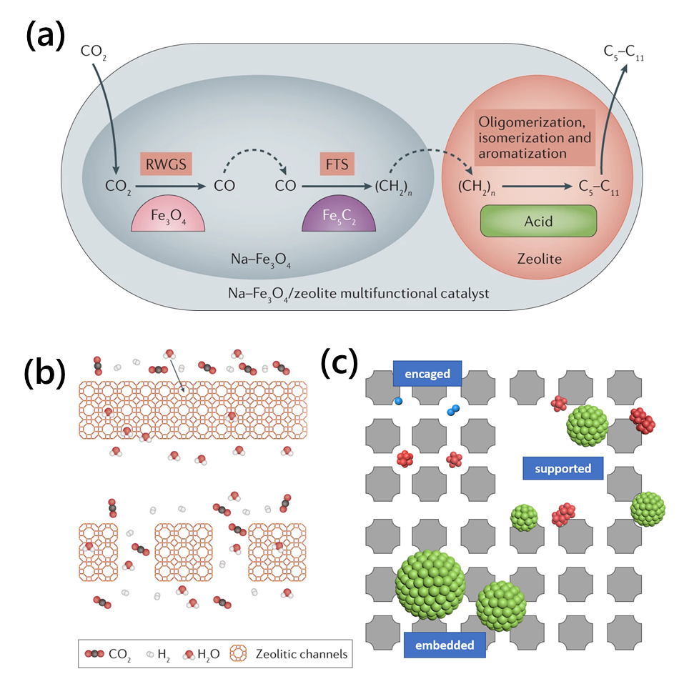 图:(a)分子筛基双功能催化剂催化CO2加氢制备C5+产物;(b)分子筛薄膜用于高温高压气体中筛分水;(c)分子筛作为载体能有效限域并稳定客体分子。