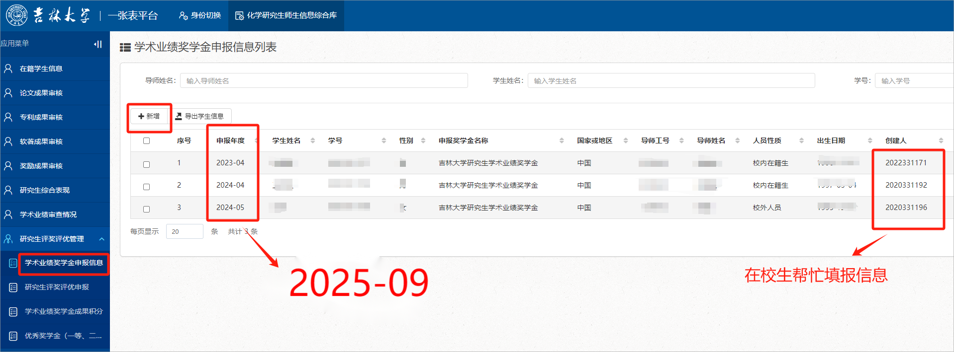 1. 使用个人邮箱账号登录“一张表”平台(https://one.jlu.edu.cn),在“研究生评奖评优管理”- “学术业绩奖学金申报信息”栏点【新增】进行申报人及银行卡信息填报。请申报人务必认真填写和核实银行卡等相关信息,确保准确无误,保证获奖者奖学金及时发放。已毕业研究生可由在校生帮忙代填。