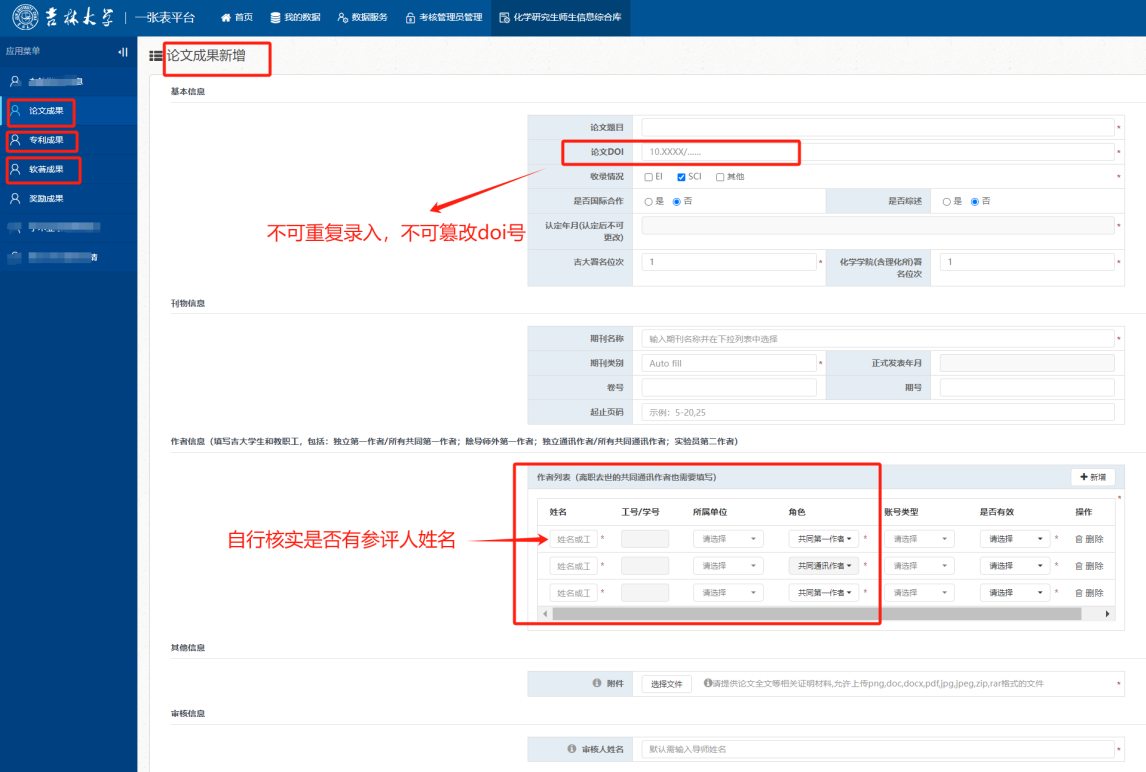 【论文成果】-【作者列表】中,角色需按照该论文作者的实际情况选择真实状态(举例:EMC易倍官方网站1名研究生与其他院校研究生同为共同第一作者,角色需填写“共同一作”)。角色包括:独立第一作者/所有共同第一作者;除导师外第一作者;独立通讯作者/所有共同通讯作者;实验员(教工)第二作者,均需填写齐全,作者具体信息仅填写吉大EMC易倍官方网站及理化所研究生和教职工即可,外单位人员不需要录入系统。【软著成果】中,软件开发人信息及成果指导教师信息均为必填。【专利成果】中,须填写所有发明人信息。署名顺序请按实际情况填写。