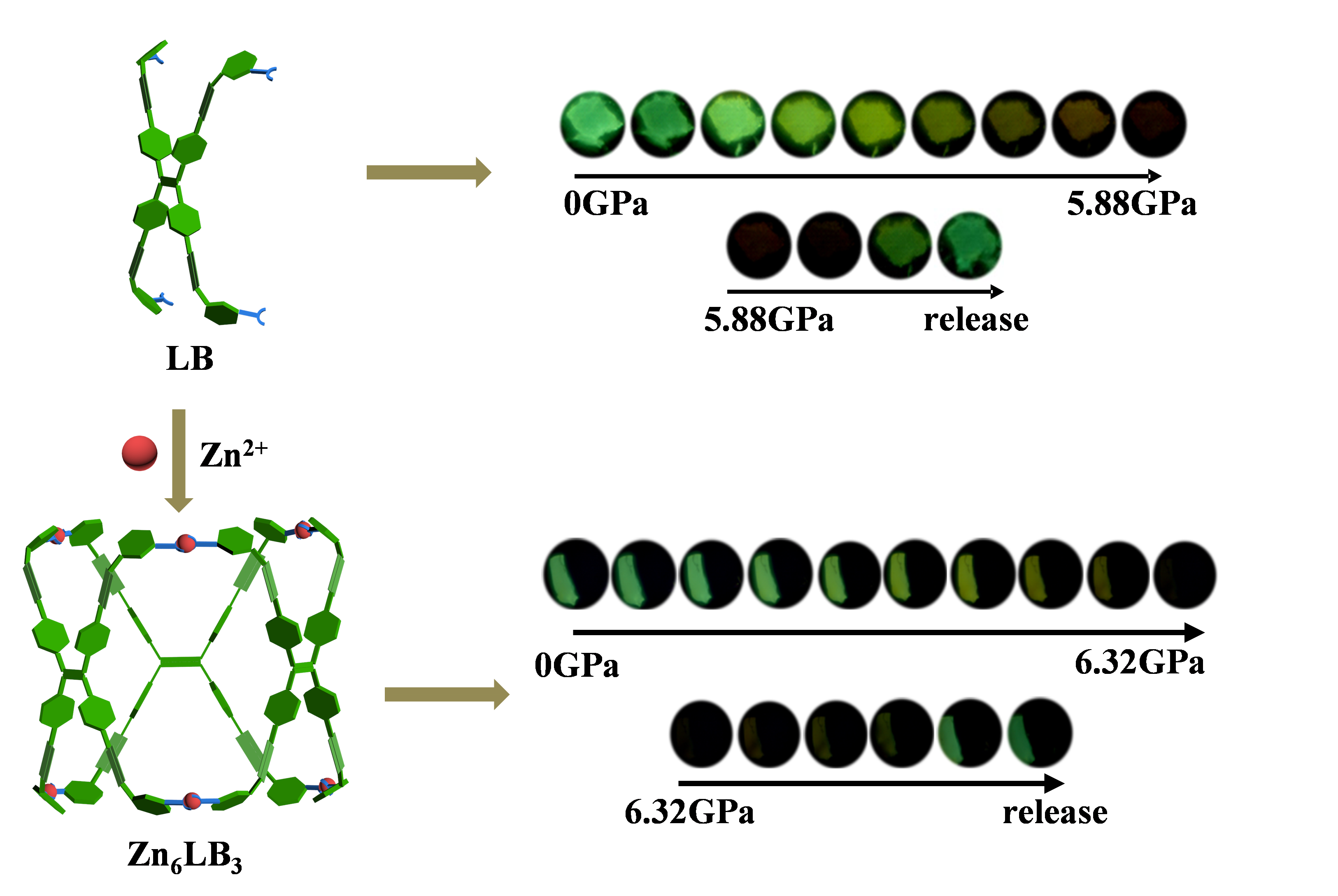 图:配体LB和超分子[Zn6LB3]的结构以及发光随外部压力的变化