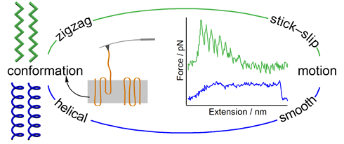 AFM单分子力谱研究晶体中聚合物链构象对链运动及纳米力学性质的影响。