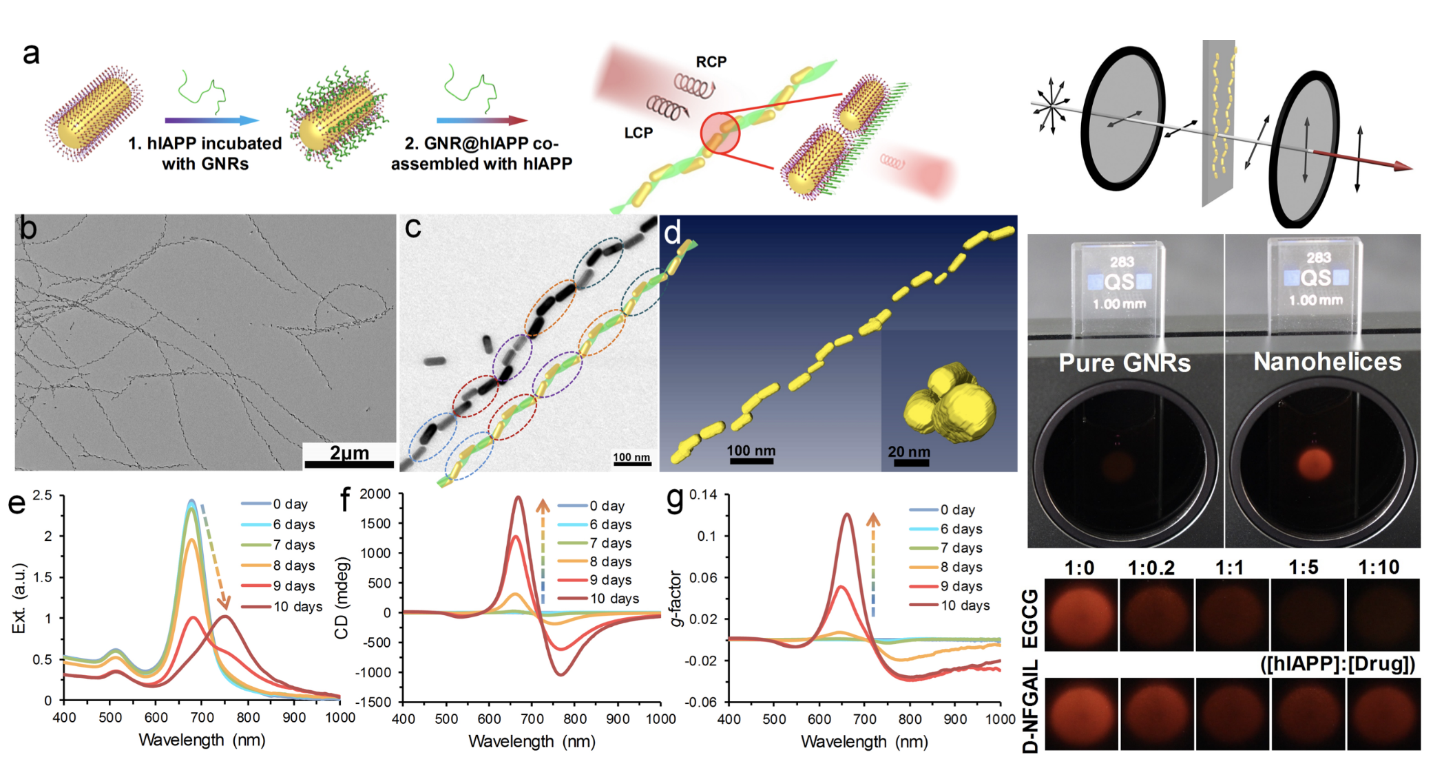 图:金纳米棒与人胰岛淀粉样多肽精准共组装构筑长程有序、具有极大的各向异性因子(g-factor=0.12)的纳米螺旋纤维。