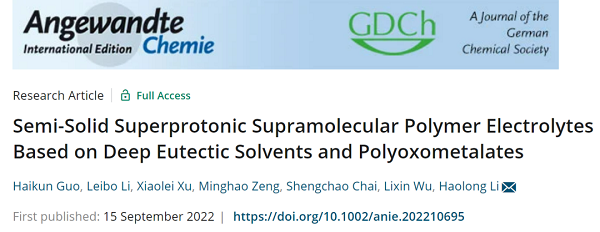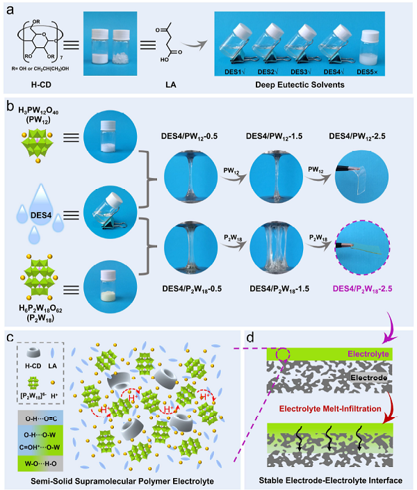 1. 这项工作通过DESs和POMs的超分子组装制备了具有强自支撑强度和高质子传导性的半固态SP电解质。