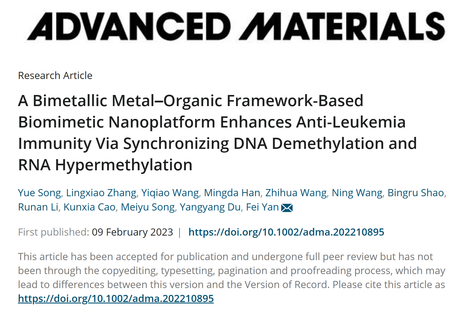 近日,EMC易倍官方网站无机合成与制备化学国家重点实验室闫飞课题组提出一种纳米表观治疗新策略,并以“A Bimetallic Metal–Organic Framework-Based Biomimetic Nanoplatform Enhances Anti-Leukemia Immunity via Synchronizing DNA Demethylation and RNA Hypermethylation”为题发表在Advanced Materials上。EMC易倍官方网站无机化学专业2020级在读硕士研究生宋岳为该论文的第一作者。
