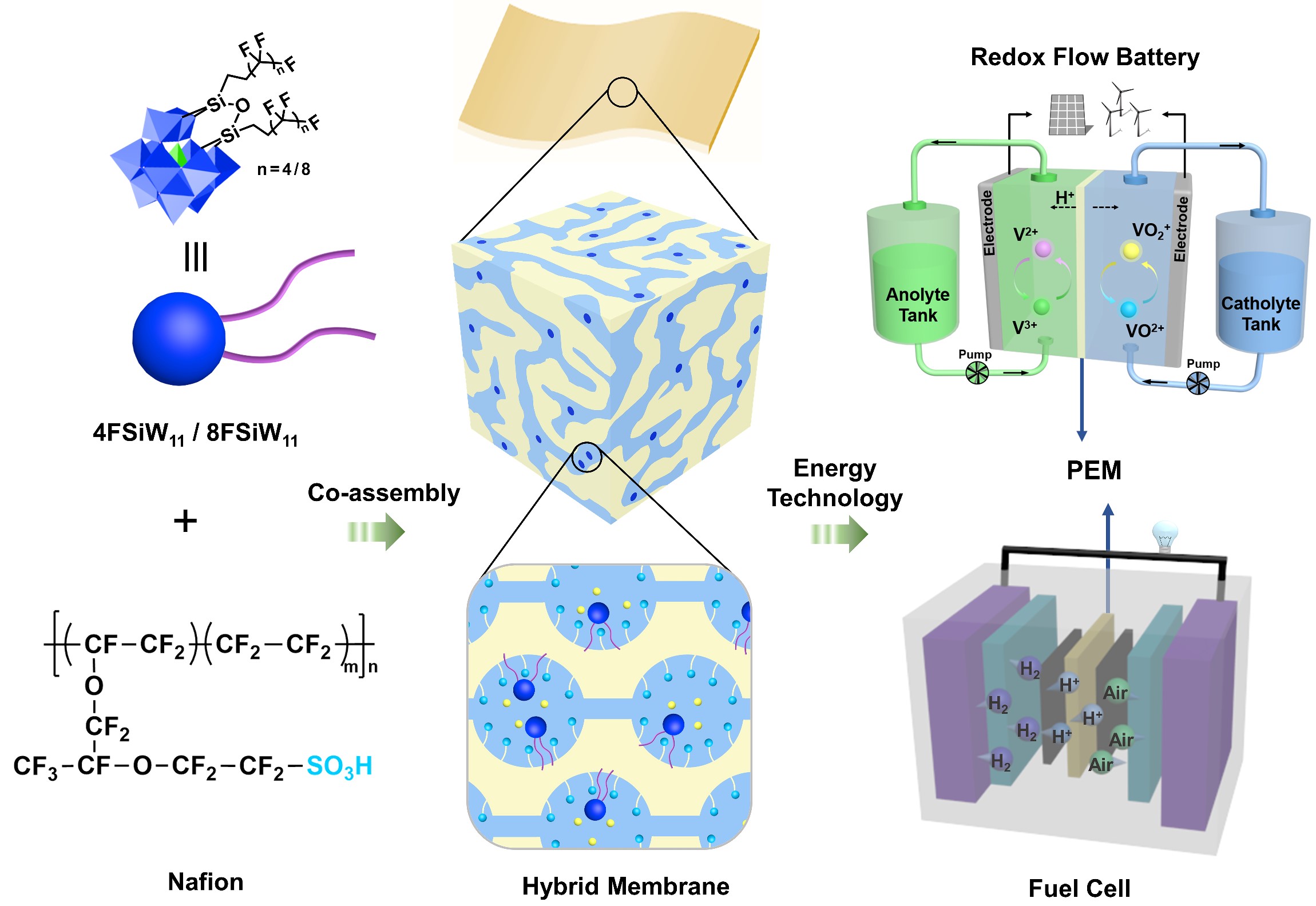 图1.氟烷链接枝POMs/Nafion杂化质子交换膜的制备及应用示意图