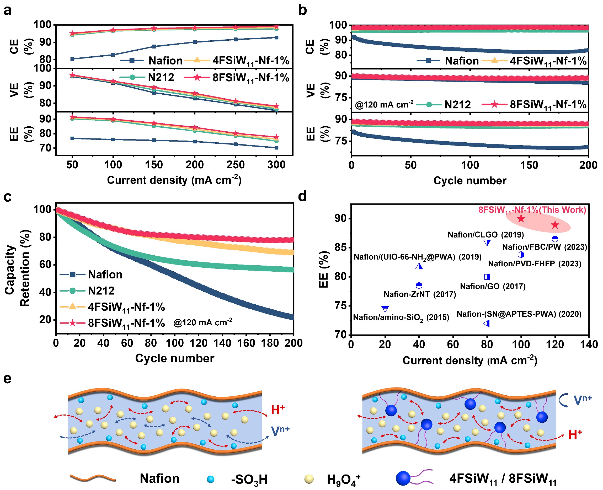 5.全钒液流电池在120mA cm-2条件下的充放电循环中表现出色,200圈循环后能量效率仍高达78%,是纯Nafion膜的3.6倍,是商用N212膜的1.4倍,与近年来已报道的杂化Nafion膜相比位于前列。