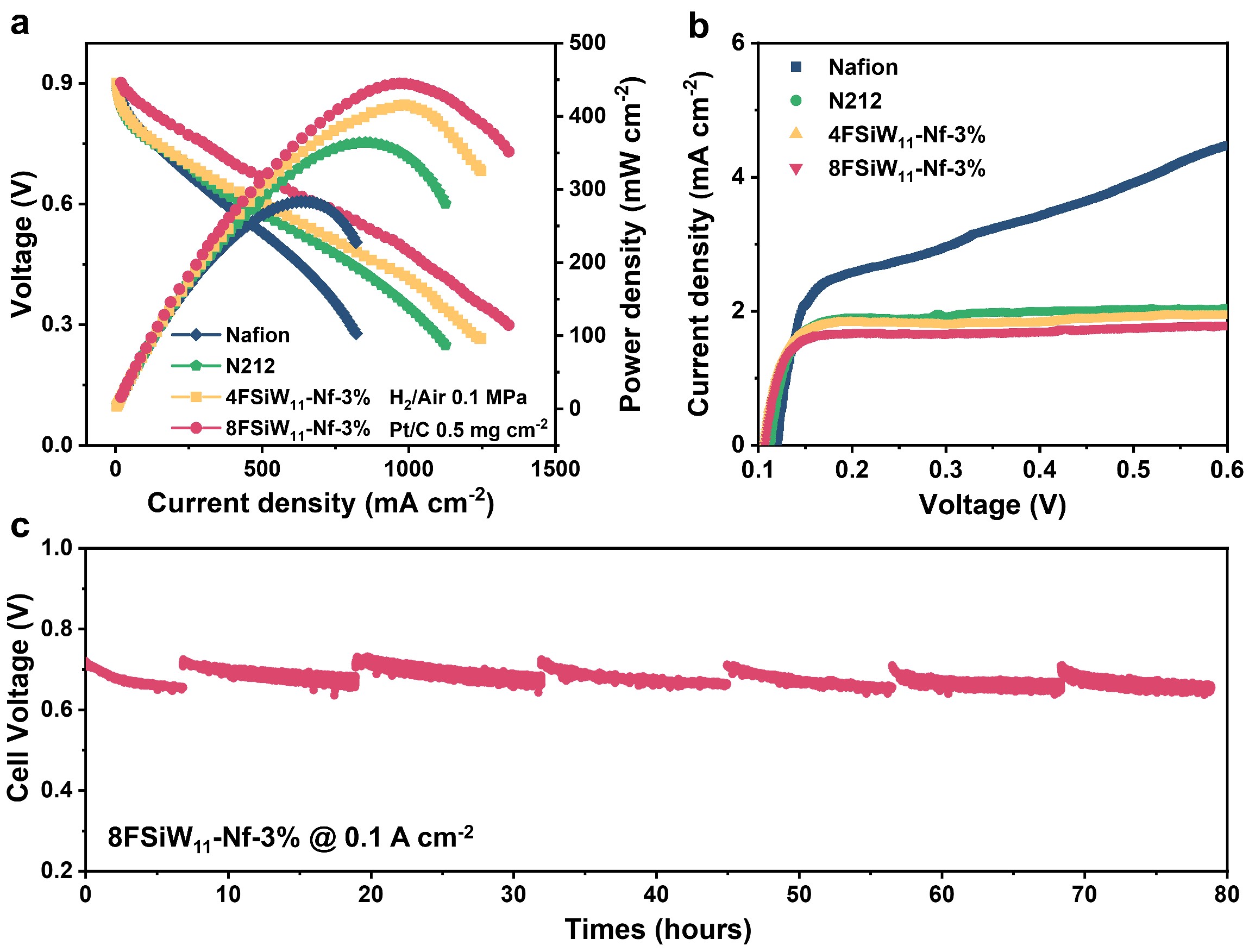 4.氢气渗透电流密度低至1.7 mA cm-2,比纯Nafion膜降低了50%;