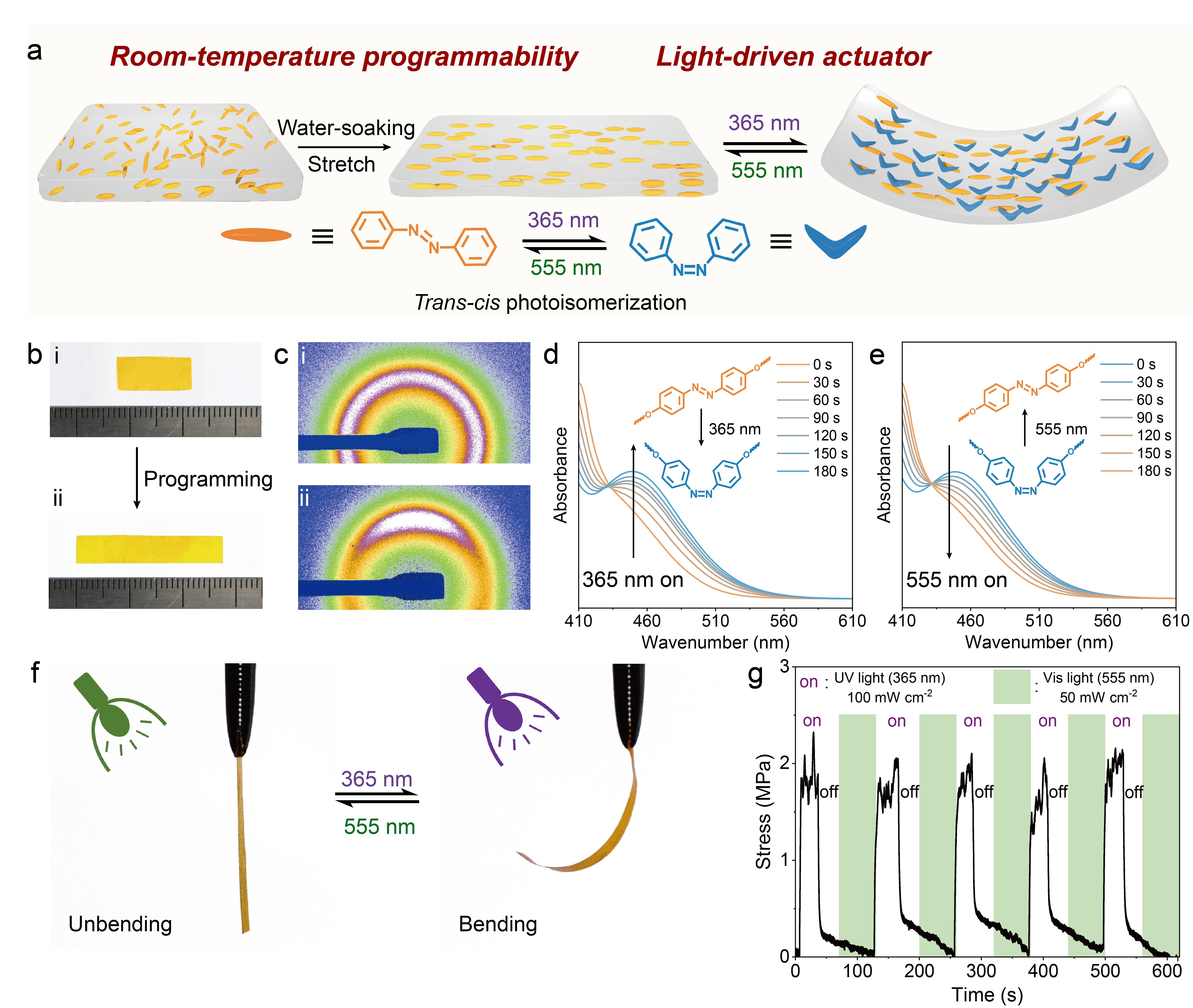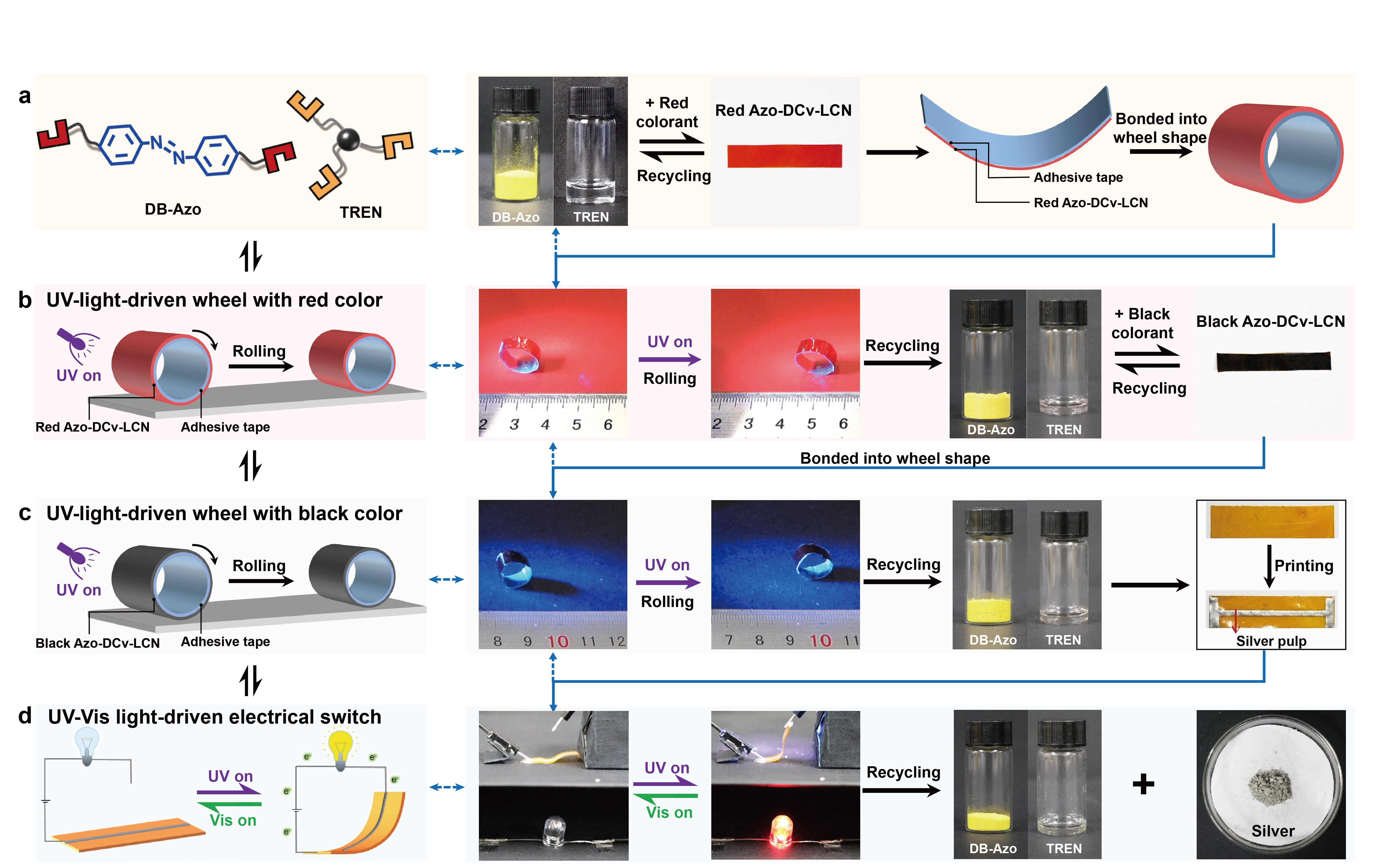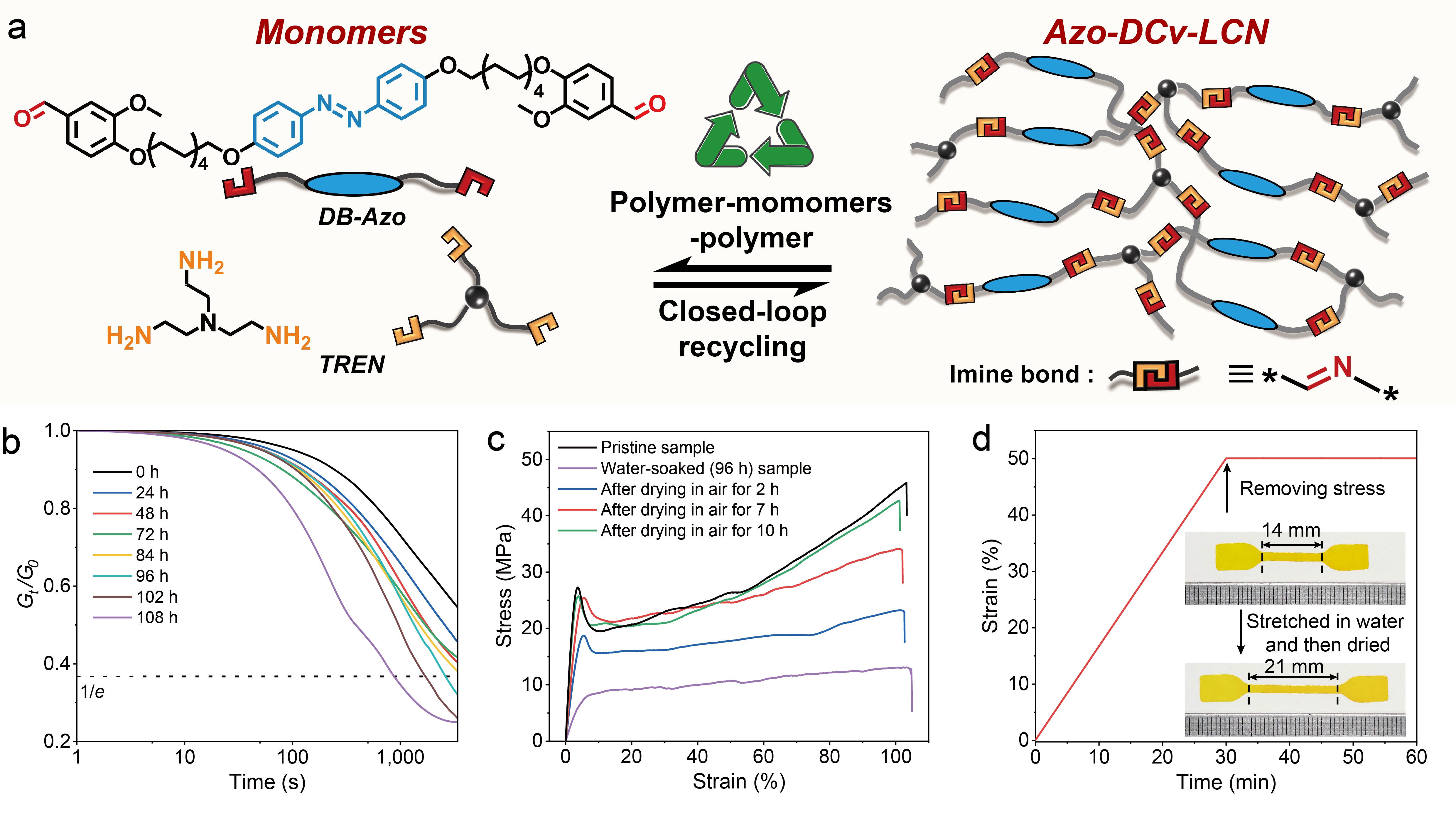 液晶网络(Liquid crystal networks, LCNs)是指含有液晶基元的交联聚合物网络。将LCNs编程使液晶基元取向排列,可获得在光、热、电等刺激下发生可逆形变的液晶驱动器,这种集感知、驱动与操控于一体的智能驱动器在人工肌肉、智能机器人、传感器等领域具有广阔的应用前景。不同于传统的永久交联LCNs,基于动态共价键交联的动态液晶网络(DCv-LCNs)可利用动态键的动态交换简化编程过程并进行随意塑形,同时可实现重新塑形、多次编程与循环利用。然而,已报道的DCv-LCNs只能实现加热条件下“聚合物到聚合物”的重塑与循环利用,且编程过程均须在加热辅助下完成。这会导致多次加热过程中聚合物网络的破坏,从而影响液晶驱动器的驱动性能。