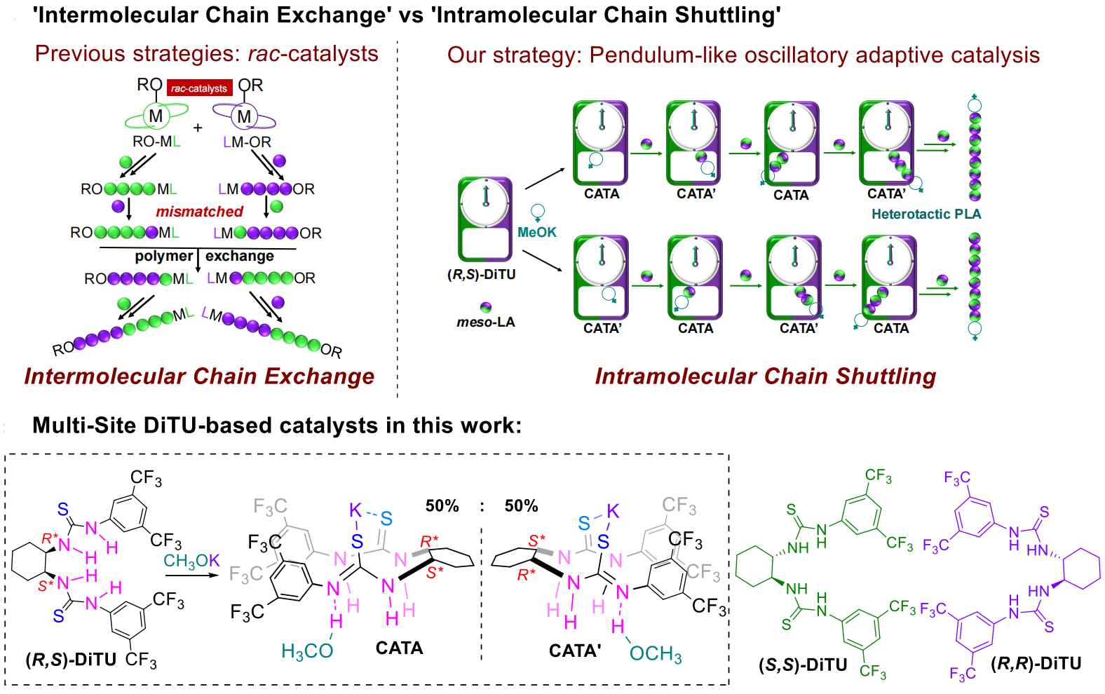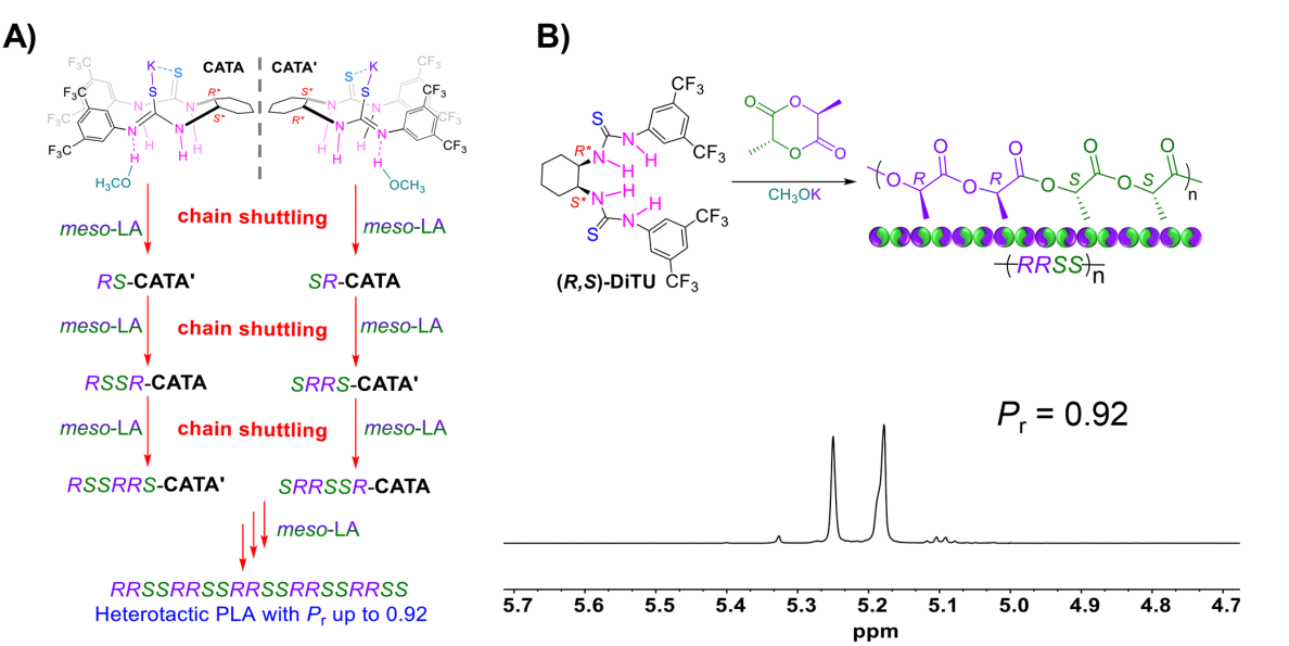 针对上述挑战,EMC易倍平台张越涛教授课题组合成了基于顺式环己二胺的双硫脲催化剂cis(R,S)-DiTU,与甲醇钾结合催化丙交酯的立体选择性聚合,双硫脲基团在钾桥的作用下相互靠近,可以在链末端手性识别和单体的立体选择性活性进行切换,实现了丙交酯的立体选择性聚合,合成了等规和杂同等规聚乳酸。
