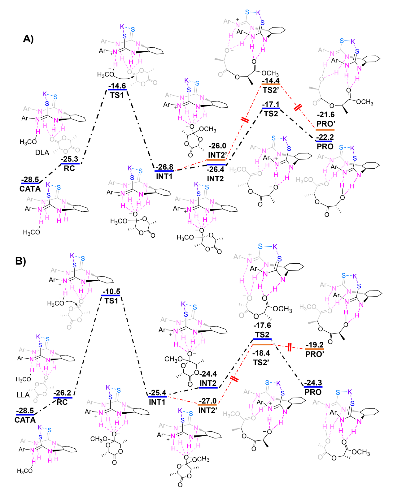 图2.CATA催化(A) DLA和(B) LLA的聚合