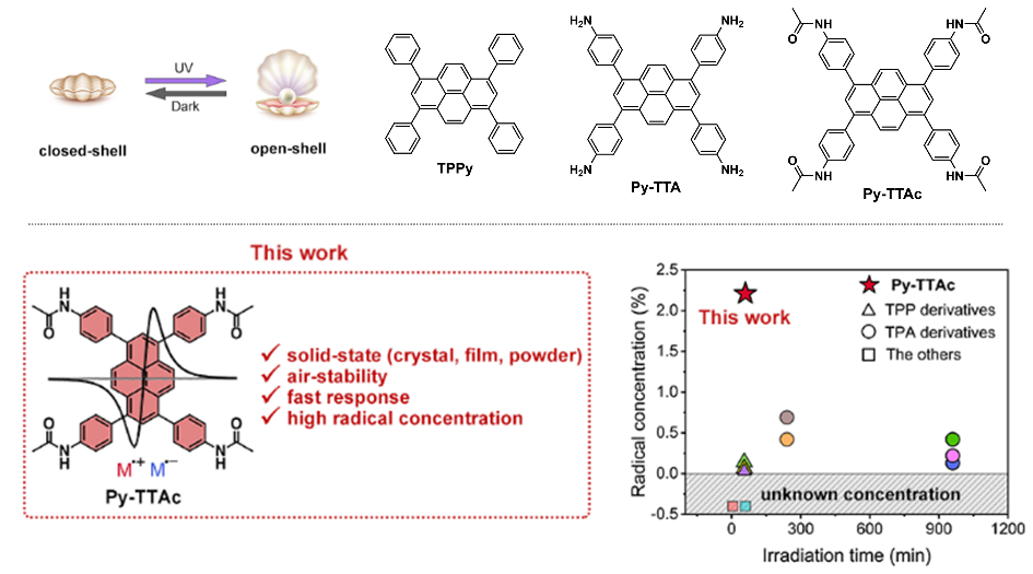 其中,光刺激响应自由基材料在分子开关器件和信息存储中具有潜在的应用前景。然而,同时实现光响应自由基材料固态下的快速响应、高稳定性以及高自由基浓度仍面临挑战。近日,EMC易倍平台李峰教授和张明教授团队以四苯基芘为研究对象,合成了一类基于平面共轭结构的对称芘衍生物,实现了固态下的快速光响应,并产生了光诱导的稳定自由基。其中,Py-TTAc的光生自由基离子对能够在空气中稳定存在超过12小时,最大自由基浓度可以达到2.21%。