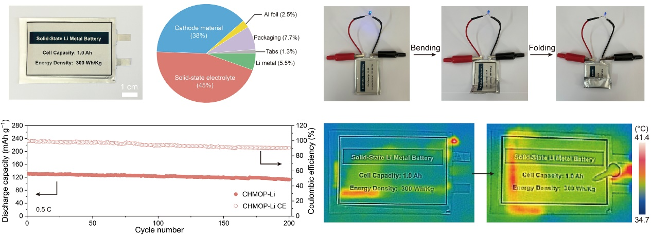 针对以上问题,徐吉静教授课题组近日提出了一种基于配位驱动的交联策略,将金属有机多面体与纤维素基共聚物进行配位,成功构筑出锂化超交联金属有机多面体聚合物(CHMOP-Li),并用作固态锂电池的固态电解质材料。这一网络结构建立了连续的离子传输通道,实现了快速的锂离子输运,在25 °C条件下展现出高达1.02×10−3S/cm的锂离子导电率,0.75的锂离子迁移数和4.72V的电化学窗口,克服了现有聚合物固态电解质离子传输的固有限制。得益于CHMOP-Li电解质膜优异的机械稳定性和界面相容性,其组装的锂对称电池在长达3200小时的循环中未出现短路现象。更值得关注的是,当该电解质应用于固态锂金属电池时,其能量密度可达300 Wh/kg,循环寿命200次,袋式电池在弯折、断裂等极端情况下也能稳定地为发光二极管供电。这项研究为设计高性能、可持续的新一代固态锂电池提供了新的解决思路。相关研究成果发表在Angew. Chem. Int. Ed. 2024, e20241572。