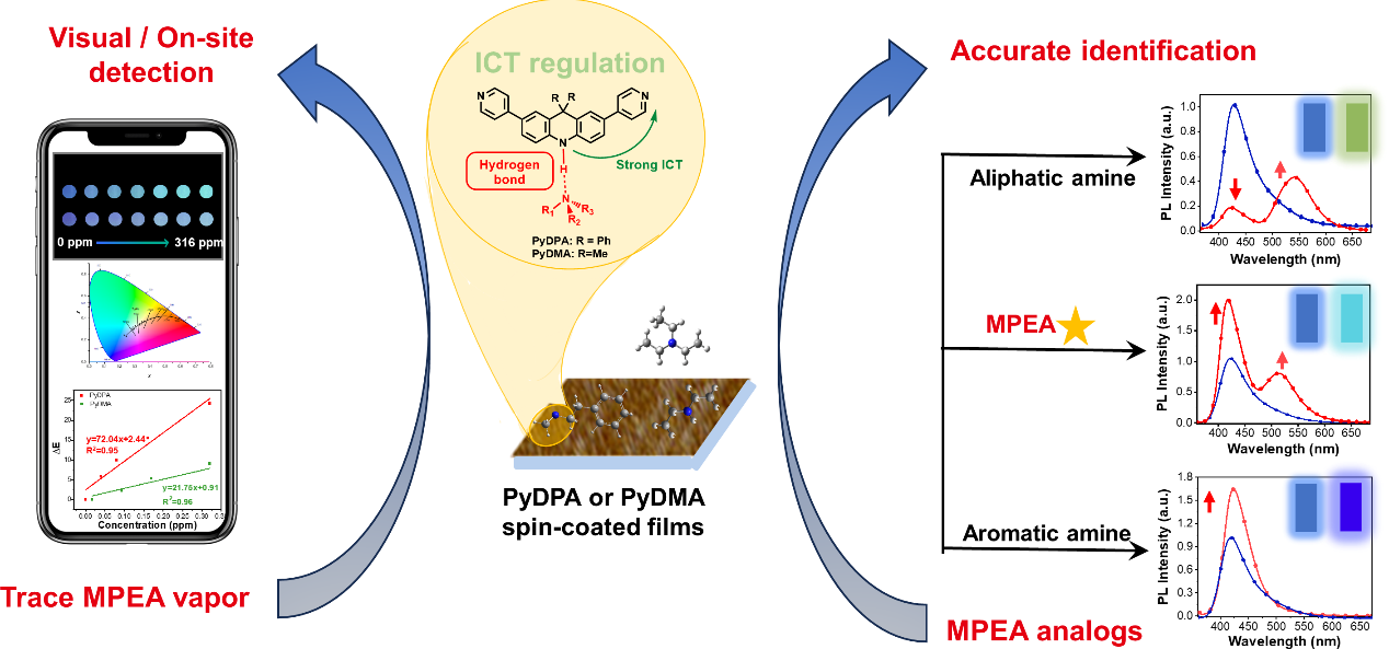 针对上述问题,EMC易倍平台的张明团队设计开发了一种非接触式荧光探针该探针通过比率型和多模式荧光响应实现了冰毒及其模拟物MPEA蒸气的快速视觉检测和准确识别。该研究在设计上受前期工作启发:二苯基吖啶为识别位点的荧光探针可以与胺形成不同强度的氢键,引起一级胺、二级胺与三级胺的差异化的响应(Adv. Funct. Mater.2023, 33, 2212980),因此有望将检测范围缩小至MPEA所属的二级胺。通过调控受体基团,该工作得到一组在聚集态下具有激基缔合物(excimer)特征发光的荧光探针。研究结果表明,这一独特的激发态特性赋予了探针多模式响应的能力,实现了基于单探针的简单、高效的传感器阵列。其中MPEA表现出不同于其他化合物的独特的双峰增强响应和青色的荧光发射。此外,该工作首次将氢键诱导的ICT调控机理引入MPEA的检测,实现了高对比度的颜色变化和裸眼可视的检测。