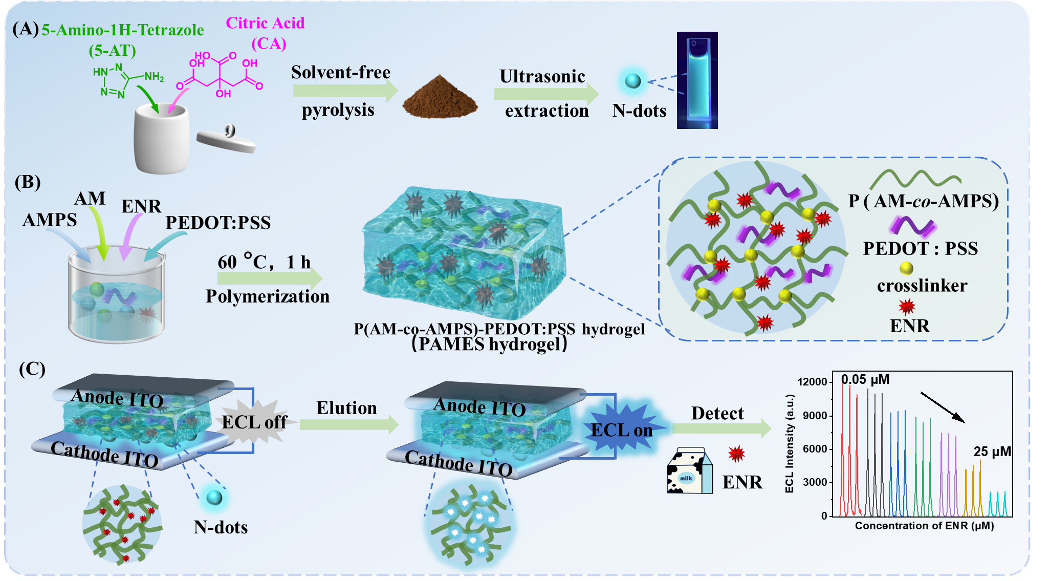 近期,EMC易倍官方网站马强教授课题组开发了一种水凝胶基准固态电解质的电化学发光(ECL)传感器用于检测牛奶中的恩诺沙星(ENR)。研究制备P(AM-co-AMPS)-PEDOT:PSS水凝胶(PAMES)作为准固态电解质,PAMES水凝胶具有较好的离子电导率、粘附性、透明度和含水量。水凝胶基准固态电解质的传感系统克服了传统液体电解质的性能限制,提高了传感器的应用性、便携性和环境适应性,实现了对食品中残留抗生素的成功检测。研究成果以“Quasi-solid hydrogel electrolyte/nitrogen dot-based electrochemiluminescence sensor for enrofloxacin detection in milk”为题,于3月12号发表在Food Chemistry期刊(doi.org/10.1016/j.foodchem.2025.143890)。