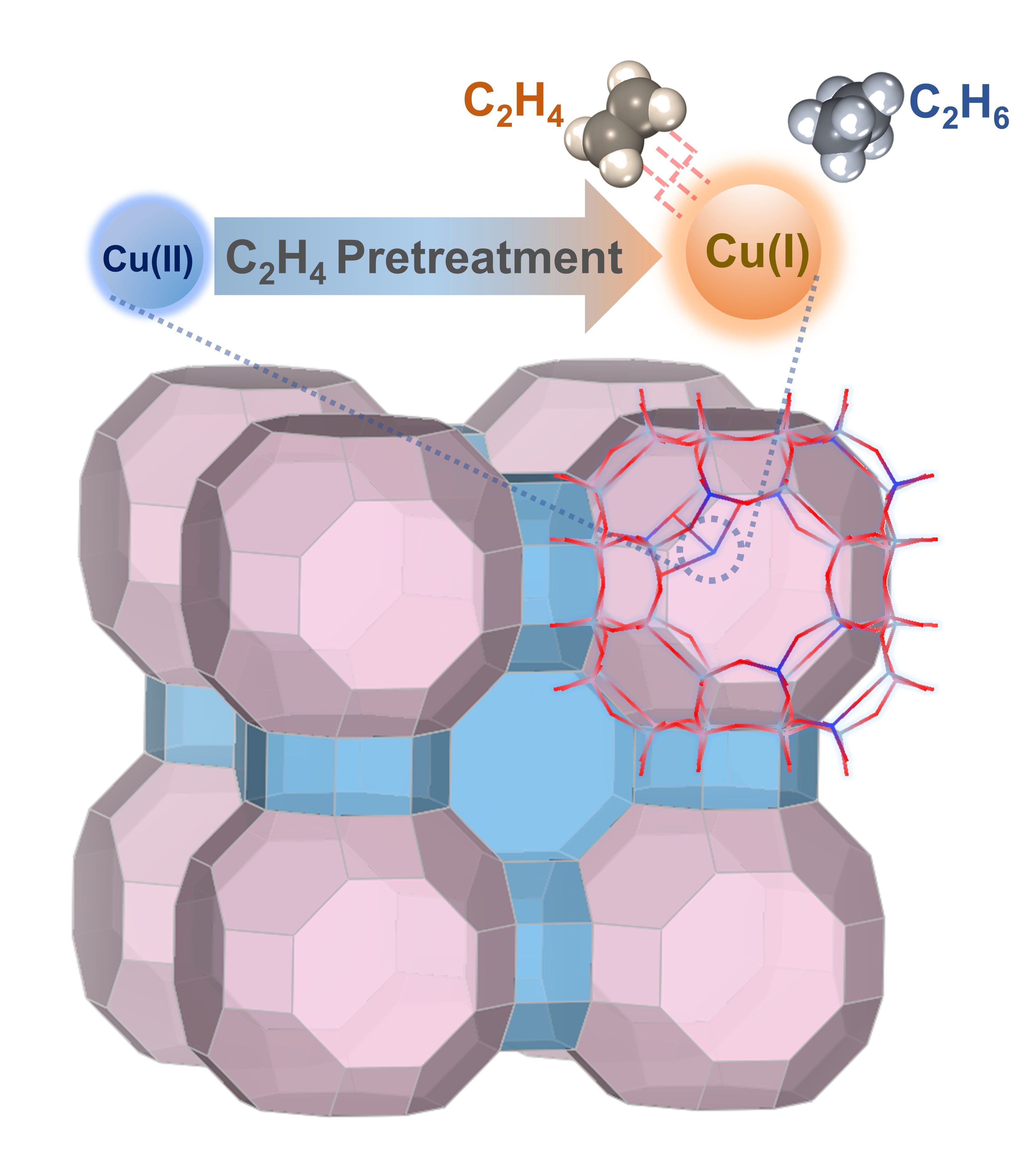图1.乙烯预处理提高Cu@SAPO-RHO分子筛的乙烯吸附分离性能示意图
