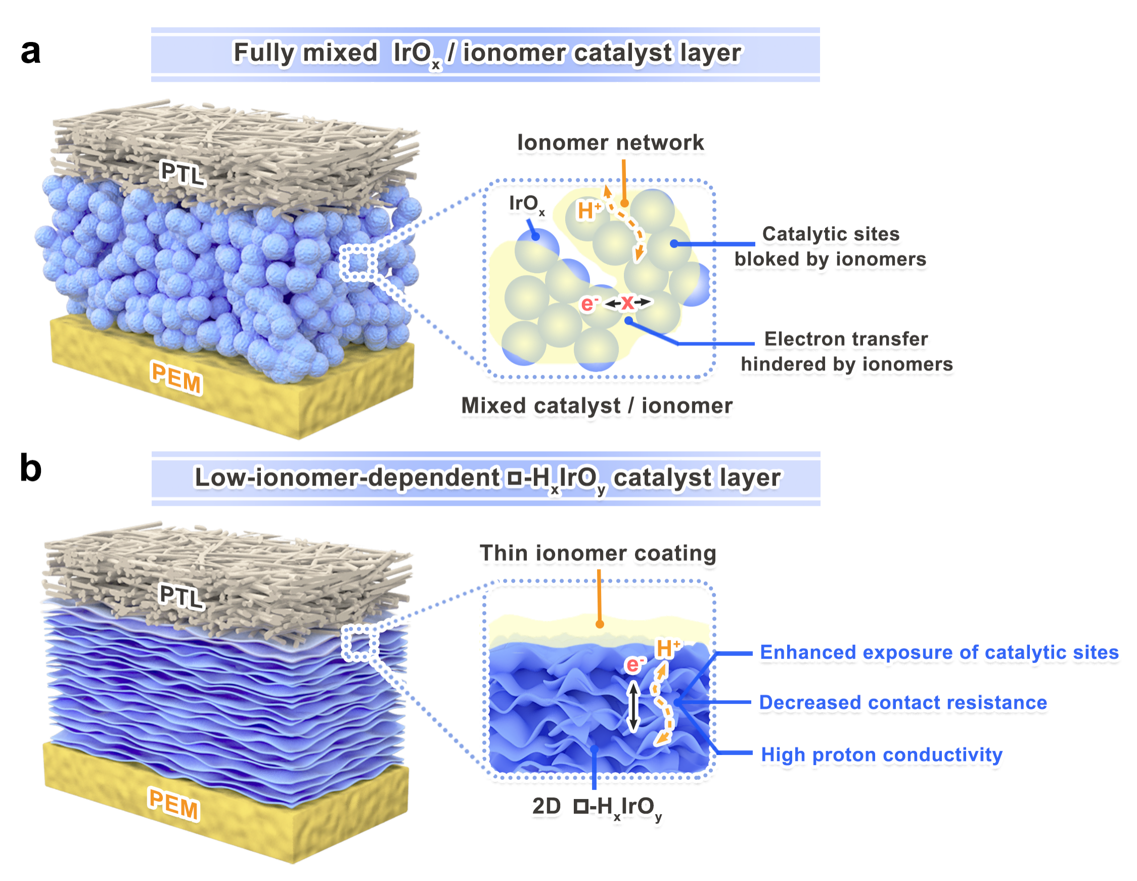 近日,EMC易倍官方网站邹晓新教授团队在质子交换膜水电解槽(PEMWE)阳极铱基催化剂研发领域取得重要进展。提高膜电极中催化剂的本征活性和贵金属利用率是减少阳极催化层铱载量的关键途径,然而传统催化层对离聚物质子传导功能的过分依赖导致了催化剂活性位点掩盖及电子传输受阻等问题,最终形成“高铱-高离聚物-低利用率”的恶性循环。基于此,团队提出构建兼具析氧催化与质子传导双功能的层状铱基氧化物(*-HxIrOy),通过催化剂的功能集成实现了膜电极85%阳极催化层无离聚物覆盖,并在低铱载量下展现出优异的催化活性和耐久性。相关成果以"Proton-Conducting, Vacancy-Rich HxIrOy Nanosheets for the Fabrication of Low-Ionomer-Dependent Anode Catalyst Layer in PEM Water Electrolyzer"为题,于4月13日发表于Angewandte Chemie上。
