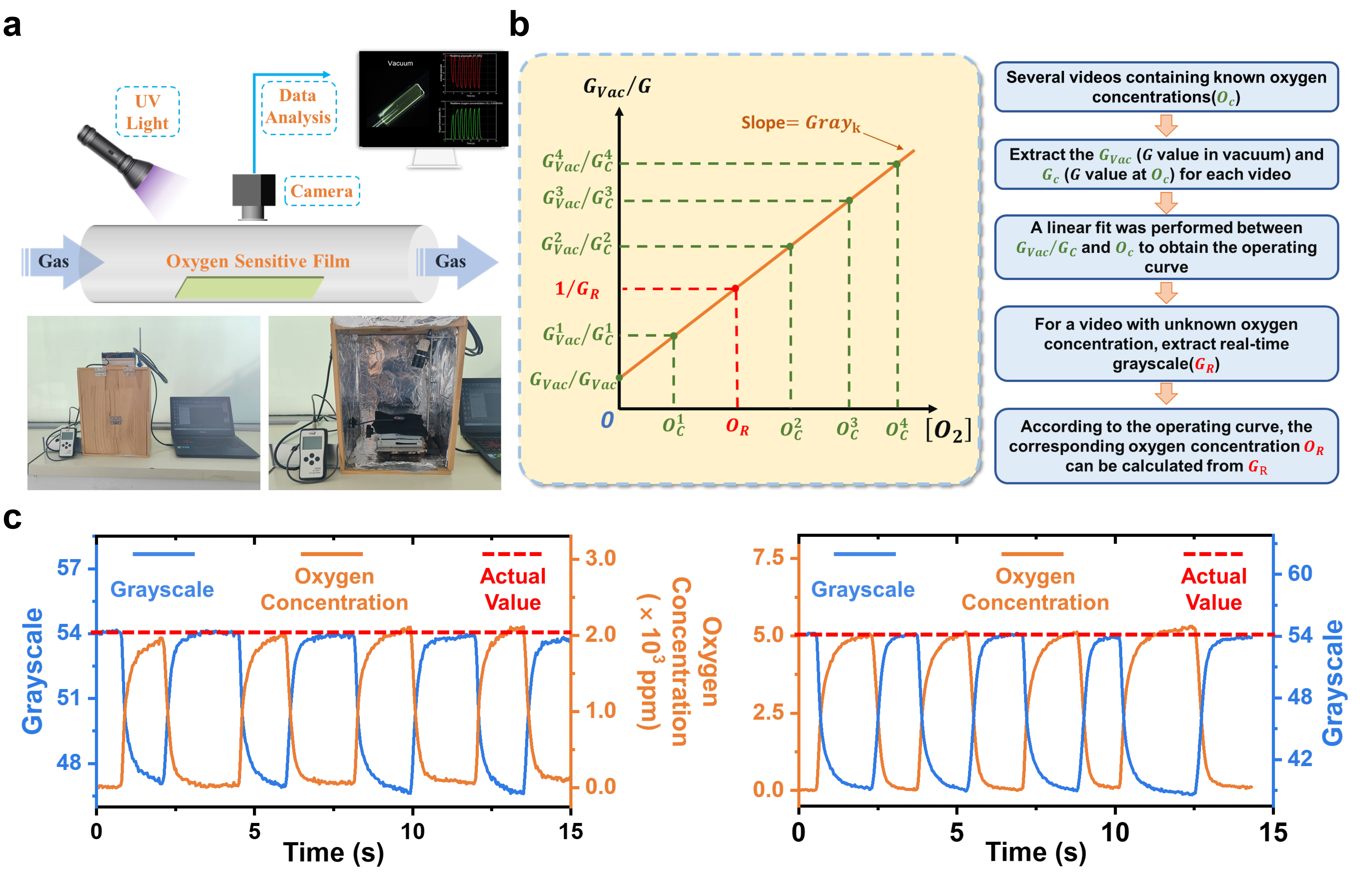图3(a)基于视频灰度的氧气浓度实时监测方案的简易实验装置和(b)实现方法;(c)利用3TA2的PMMA掺杂薄膜检测实际氧含量0.2%和0.5%的氮氧混合气。