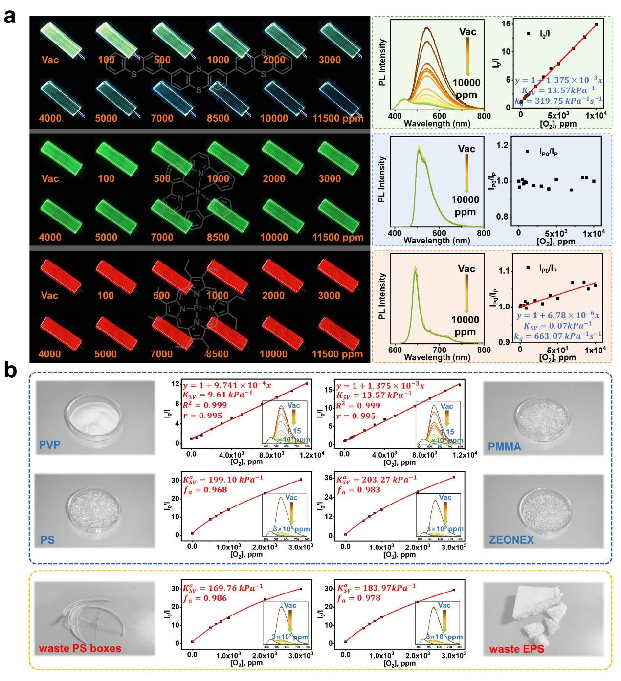 针对这一问题,基于折叠诱导自旋轨道耦合增强策略,课题组开发了一种兼具高发光效率和氧气敏感性的纯有机RTP材料,该材料展现出41.6%的RTP效率和近乎完全分离的荧光-RTP双发射特征:其RTP强度对氧气浓度变化十分敏感,而荧光信号保持稳定,借此实现了无需外源参比物的本征型单组分比率式氧传感。得益于3TA2优异的基质适应性,通过调控聚合物基质的氧气透过系数即可实现灵敏度的灵活调控,其中以ZEONEX-340R为基质的薄膜Stern-Volmer常数(KSV)高达203.3 kPa-1,这是目前纯有机RTP氧传感材料的最高记录之一。另外,即使采用废旧聚苯乙烯泡沫(EPS)作为基质,KSV仍能维持在180 kPa-1以上,充分证明了该材料在实际应用中的低成本、可靠性和环境适应性。