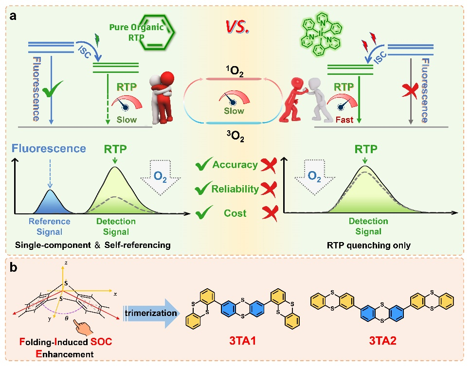 图1 (a)金属-有机配合物与纯有机RTP材料在光学氧传感中的比较;(b)通过噻蒽共价三聚化构建纯有机氧敏RTP材料