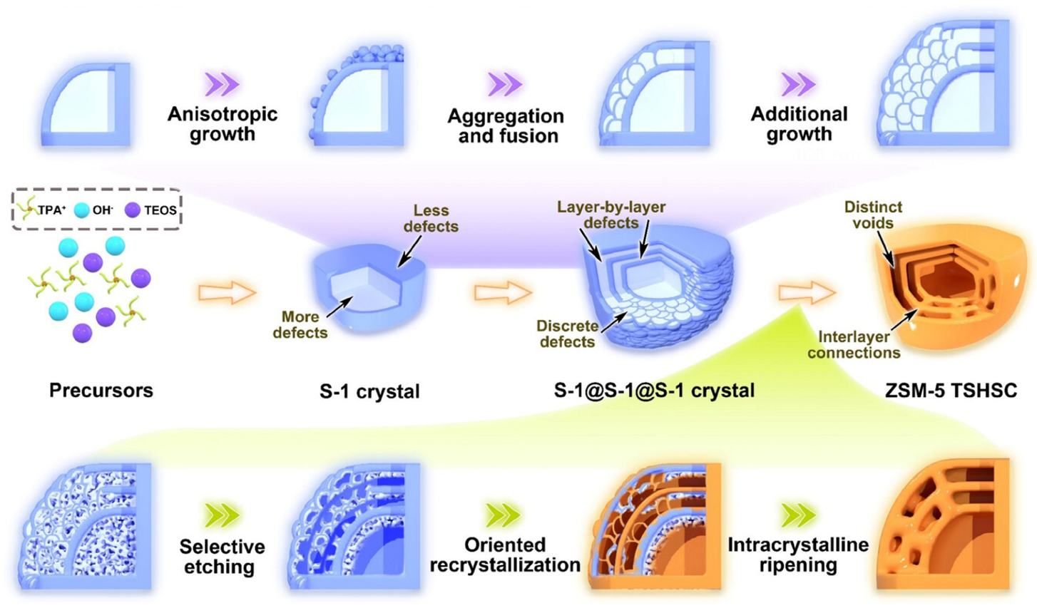 分子筛作为一类具有本征酸性活性位点和优异水热稳定性的结晶微孔材料,已在工业催化领域得到广泛应用。然而,其狭窄的微孔孔道(通常小于2 nm)导致的扩散限制效应严重制约了其传质动力学,使催化效率显著降低。因此,将多层中空结构应用于分子筛材料,不仅能够突破传统微孔材料的扩散限制,大幅提高了活性位点的可及性,也可以精确调控分子筛纳米壳层与封装的功能组分之间的空间协同效应,实现了对复杂催化反应的时空动态操控。