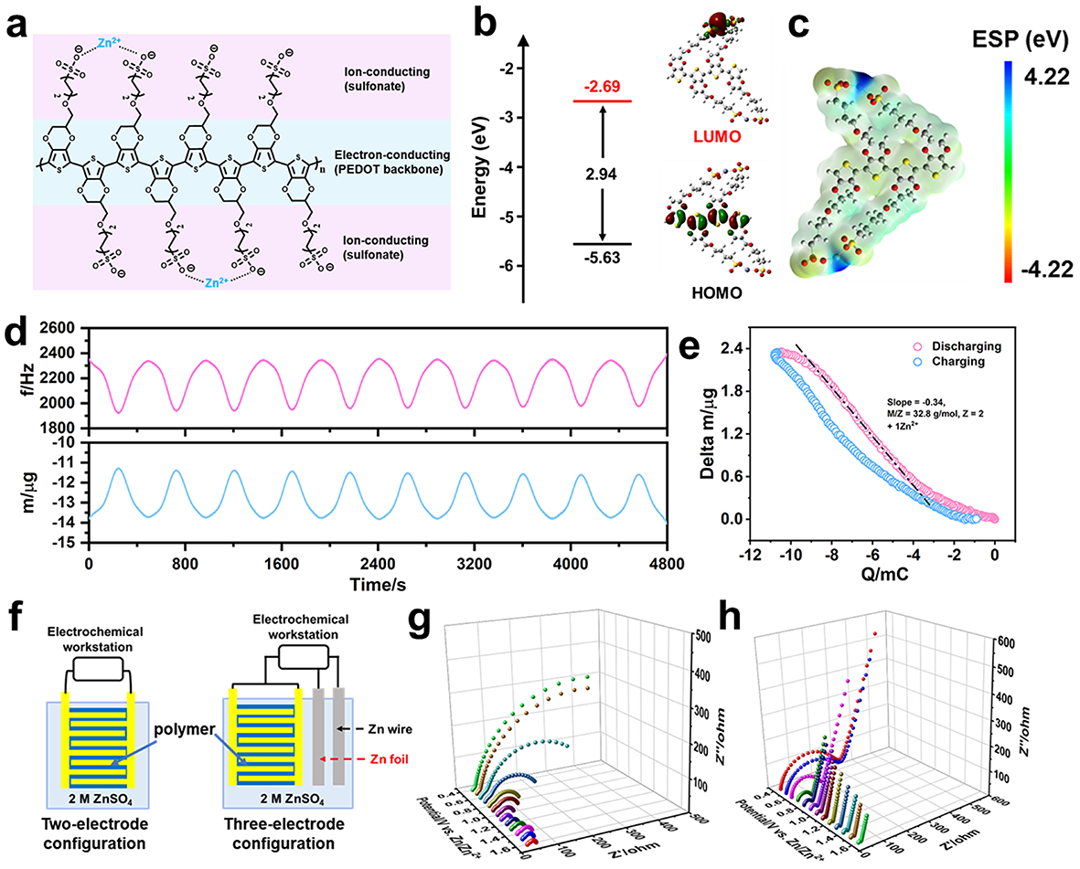 针对这一问题,EMC易倍平台晁单明教授联合吉林师范大学冯明教授,中科经理春应化所王颖教授团队,提出一种集成式的有机混合电子/离子导体(OMEIC),通过空间耦合电荷传输路径,实现电荷(Zn2+/e-)的重新分配和快速传输。通过原位石英晶体微天平技术揭示了OMEIC的自掺杂行为和锌离子配位/解离的独特电荷存储机制。并通过原位电化学阻抗技术研究了OMEIC的电子/离子电导率随实时电位的变化,证明了其在时间尺度上固有的优异导电特性。通过钒氧化物的层间限域作用,在纳米尺度上构建双导电路径,进而提高电荷密度并加速离子扩散,产生更多的活性位点并加速反应动力学,从而增强正极的实际电化学性能。