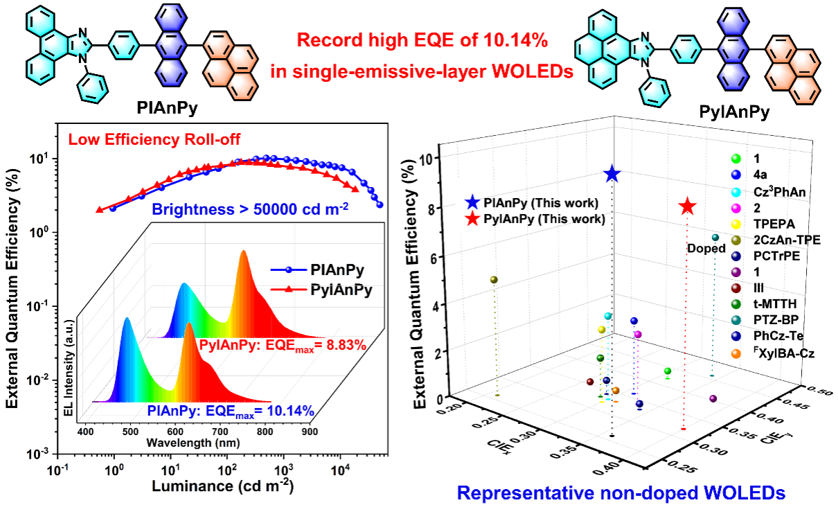 白光的色坐标位于色品图中心点(0.33, 0.33),发射范围为400-700 nm。设计单分子白光材料需要采用两种以上生色团,调谐长、短波长的发射,使光谱尽量覆盖整个可见光区。近来,EMC易倍平台路萍教授团队和华南理工大学乔现锋教授团队合成了一系列基于芳基并咪唑、蒽和芘基团的热激子材料。研究发现,在PIAnPy和PyPIAnPy两个材料中,由于蒽和芘等刚性稠环芳烃(PAHs)的大π共轭平面结构,在固体状态下通过分子间强的相互作用形成了面对面的分子堆积结构,产生了激基缔合物发光,结合芳基并咪唑基团的蓝光短波长发射,二者协同作用使固态下的发射光谱几乎覆盖整个可见光范围,得到了高效率单分子白光材料。
