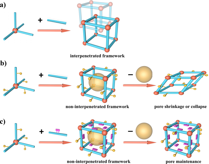 三维介孔共价有机框架材料(3D-COFs)是一种孔径介于微孔与大孔之间的具有高比表面积和三维贯穿孔道的新型多孔聚合物。这种材料不仅有着高度有序的孔道结构和均一的孔径尺寸,而且具有高的热稳定性和化学稳定性。此外它还在催化、吸附、分离及光、电、磁等许多领域存在潜在的应用前景。因此这种材料的研究和开发对于理论研究和实际生产都具有重要意义。但是一直以来成功合成这类材料面临两个问题:(1)3D-COFs在合成过程中有着结构穿插现象,并且随着配体的增长穿插程度进一步增加。因此通过增加配体长度提升孔径从而达到介孔尺寸的方法是难以实现的。(2)3D-COFs有着强烈的动态呼吸效应,因此孔道里的客体分子被去除后会发生孔径收缩甚至坍塌的情况。因此,如何解决这两个难题对合成介孔3D-COFs具有重要意义,同时也是一个巨大的挑战。最近,方千荣课题组首次报道了通过增加位阻效应合成非贯穿金刚石拓扑(dia)的介孔3D-COFs(3D-Meso-COFs)的方法。这种方法在三维介孔有机框架的设计合成及孔道调控的研究上意义重大。