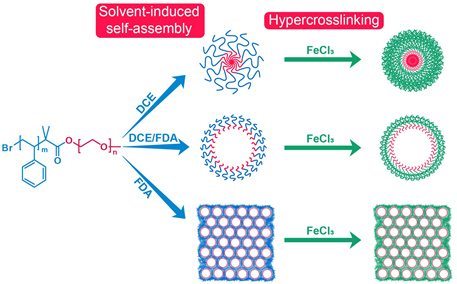 EMC易倍平台乔振安教授课题组设计合成了两亲性嵌段共聚物聚乙二醇-聚苯乙烯(PEO-b-PS),通过溶剂诱导嵌段共聚物自组装的方法合成了具有多级孔结构的超交联聚合物。与前人的工作不同,该方法创造性地把模板剂与前驱体结合在一起,用嵌段共聚物PEO-b-PS在甲缩醛与1,2-二氯乙烷混合溶剂中形成的胶束作为反应的“单体”,通过交联反应将不稳定的胶束转化为稳定的超交联聚合物。而通过调节胶束的组装状态,就可以改变所得到产物的形貌。