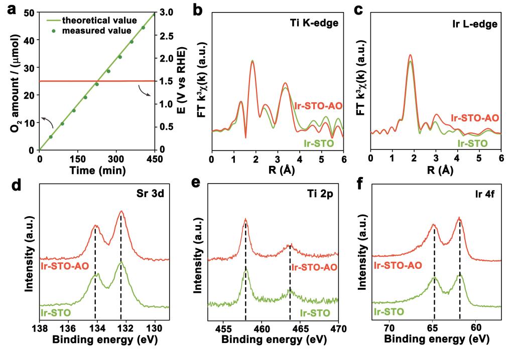酸性水氧化催化剂在催化过程中会面临强酸性与强氧化性两大腐蚀环境的挑战。因此,大多数催化剂往往难以胜任稳定催化的工作。实验结果证明,Ir-STO能够在酸性环境中稳定催化水氧化反应的同时保持自身的晶体结构。另一方面,具有与Ir-STO相似准立方结构的3C-SrIrO3在酸性水氧化过程中往往会经历严重的表面重构过程,这一鲜明对比说明:SrTiO3作为稳健的主体材料,在Ir-STO的优异结构稳定性中起到了关键作用。