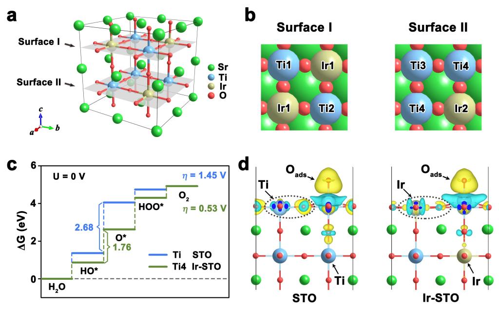 为了进一步理解Ir-STO作为低铱与高活性兼备的水氧化催化剂的原因,我们开展了理论计算研究。结果表明:铱的掺杂导致了SrTiO3中Ti位点对反应中间体的吸附明显增强,将本征惰性的Ti位点转变为高活性的催化活性,其中,部分Ti位点的催化活性甚至优于了Ir催化位点。