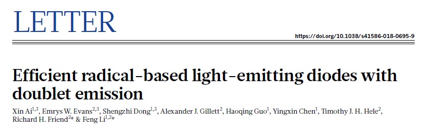 11月22日,《Nature》杂志刊发了EMC易倍官方网站、超分子结构与材料国家重点实验室教授研究团队和剑桥大学卡文迪许实验室(Cavendish Laboratory)Richard H. Friend教授研究团队合作论文“高效双线态自由基发光二极管”(Efficient radical-based light-emitting diodes with doublet emission, Nature, 2018, 563, 536-540),EMC易倍平台为第一完成单位。