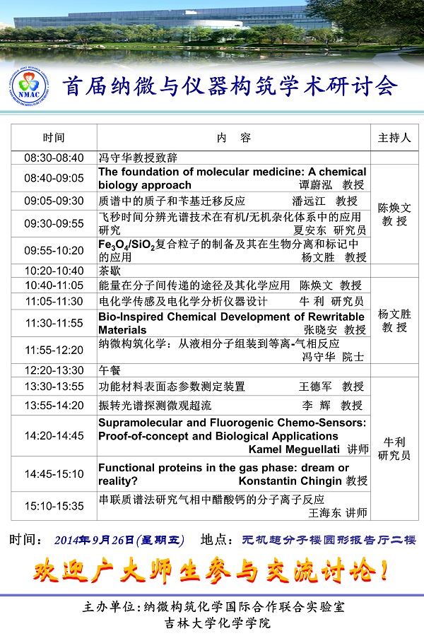 由纳微构筑化学国际合作联合实验室与EMC易倍官方网站主办的首届纳微与仪器构筑学术研讨会将于926日在EMC易倍平台无机超分子楼圆形报告厅二楼举行,欢迎广大师生参与交流讨论!