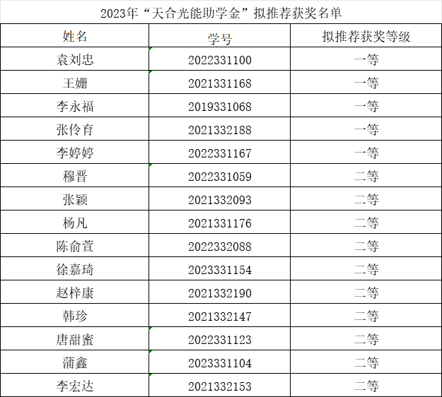 按照EMC易倍官方网站2023年“天合光能助学金”评选工作安排,经研究生申报、研办审核、专家评选,拟推荐获奖名单公示如下,如有异议请与赵晓杰老师联系,联系电话13504470223。
