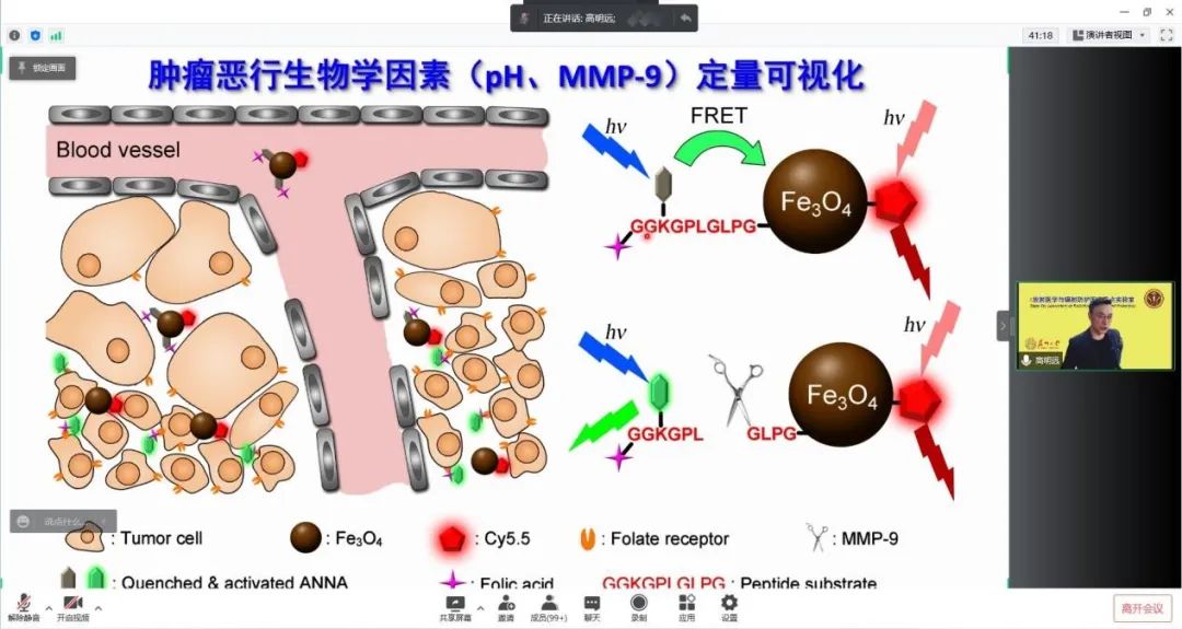 首先,高明远教授从光学成像、光声成像、磁共振成像、上转换/磁共振成像几个角度为同学们介绍了分子影像学的起源以及目前分子影像学研究的主要方法。同时,高明远教授也在讲座中与同学们分享了他的团队围绕“无创看到病”开展的一系列关于肿瘤、软组织疾病分子成像的研究收获,在工作中发展了新型高质量纳米氧化铁磁共振对比剂的制备路线,推动了其临床转化进程;利用纳米材料优异的本征物理特性,提出了诊疗一体化纳米探针的新构建策略以降低其临床转化风险;发展了多种病生理相关分子的活体定量可视化方法。