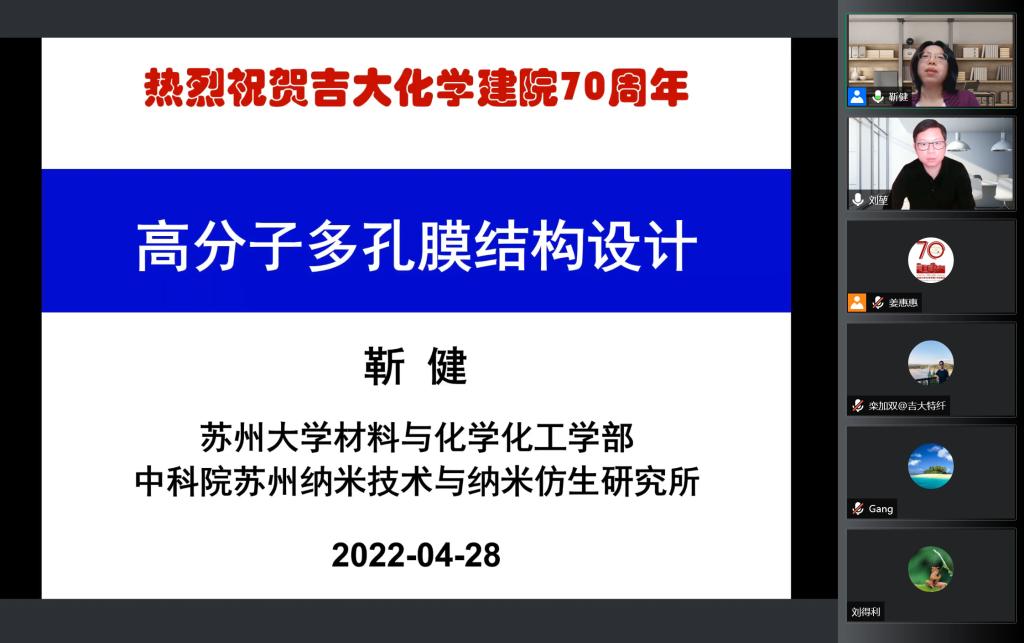 4月28日上午,苏州大学特聘教授,国家杰出青年科学基金获得者靳健应邀线上做客“吉大化学七十年——科学与未来系列讲座”,以“高分子多孔膜结构设计”为题,为公司师生作学术报告。