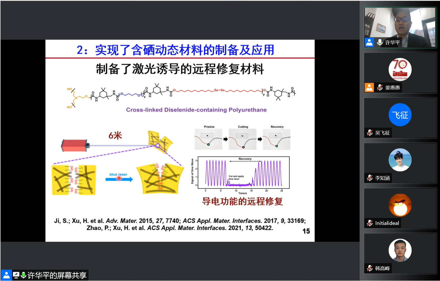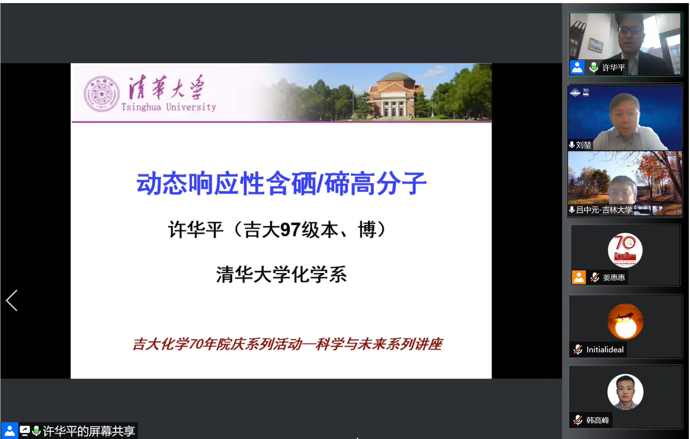 5月8日上午,清华大学化学系教授、国家杰出青年科学基金获得者许华平应邀线上做客“吉大化学七十年——科学与未来系列讲座”,以“动态响应性含硒/碲高分子”为题,为公司师生作学术报告。