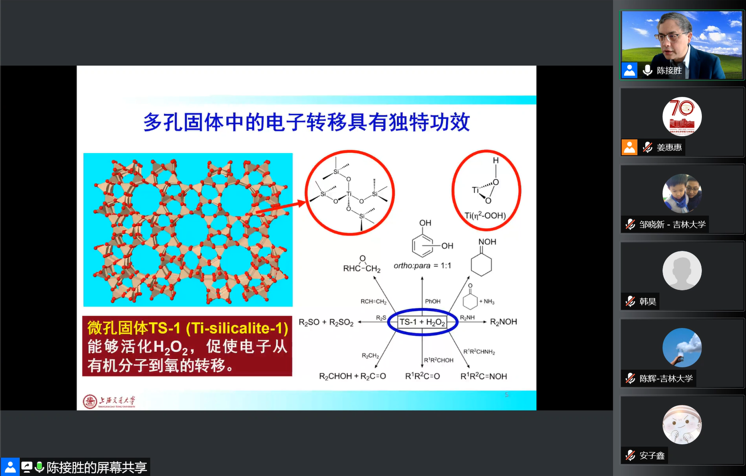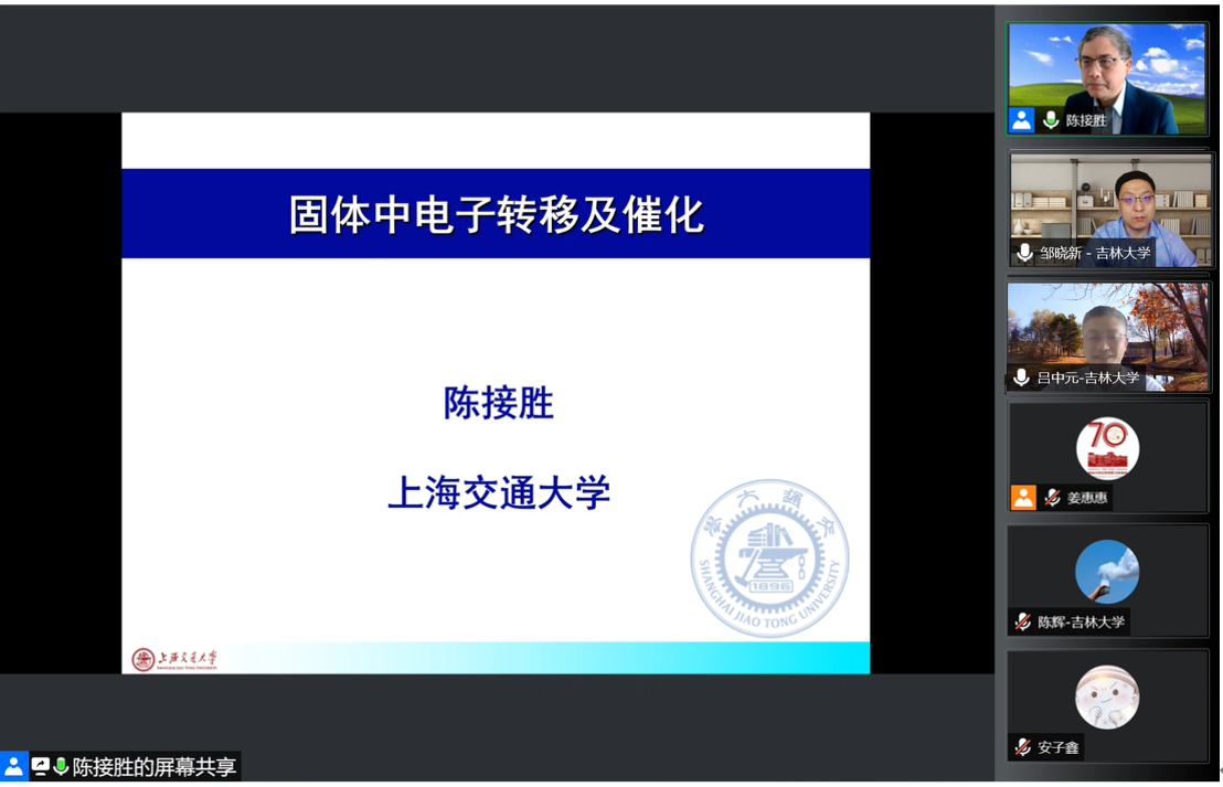 5月22日上午,上海交通大学化学化工公司教授,国家杰出青年科学基金获得者陈接胜应邀线上做客“吉大化学七十年——科学与未来系列讲座”,以“固体中电子转移及催化”为题,为公司师生作学术报告。