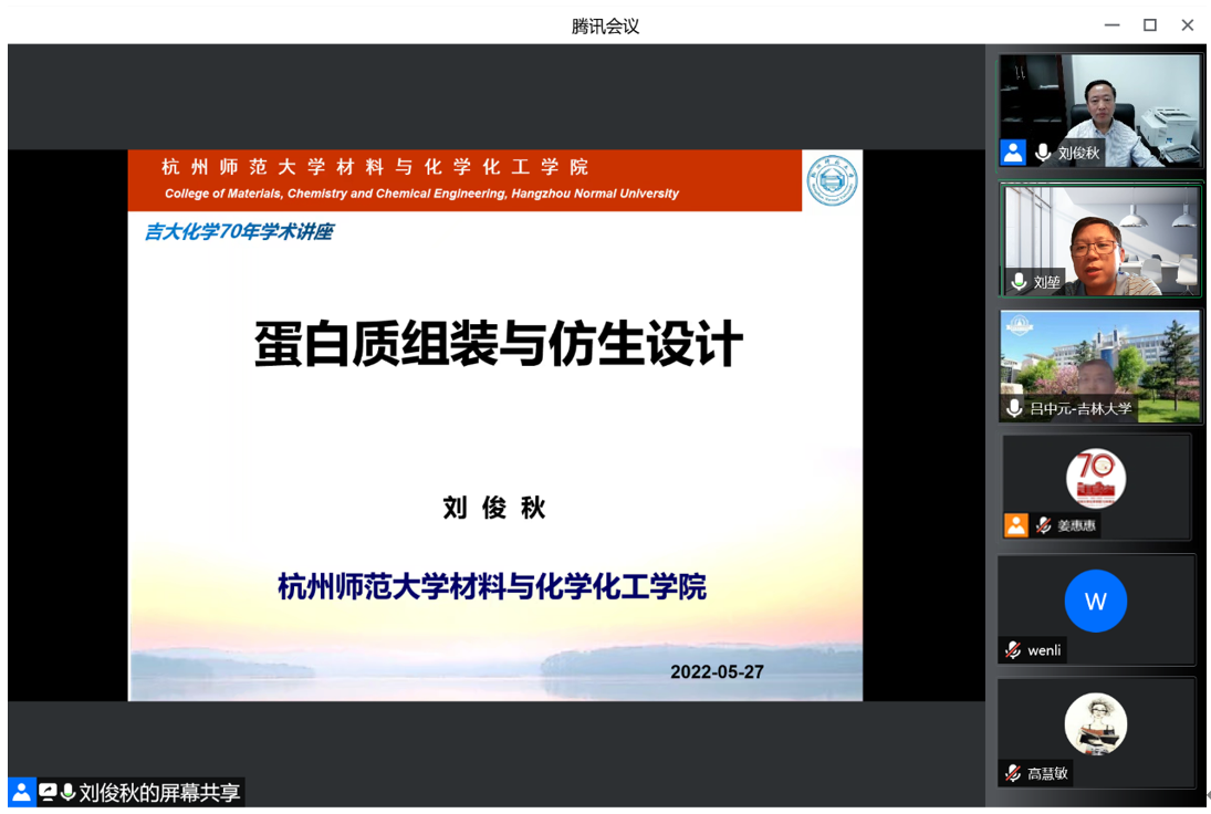 5月27日下午,杭州师范大学教授,国家杰出青年科学基金获得者刘俊秋应邀线上做客“吉大化学七十年——科学与未来系列讲座”,以“蛋白质组装与仿生设计”为题,为公司师生作学术报告。