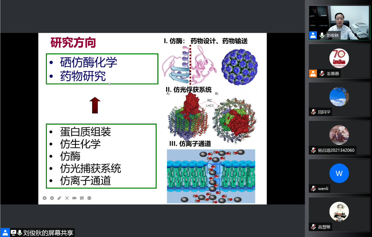 讲座中,刘俊秋教授围绕蛋白质组装与仿生设计,全面地介绍了其课题组在蛋白质精准组装、仿酶催化、仿生光捕获系统等方面的研究进展。在交流互动环节,刘俊秋教授耐心详细地解答了院内外师生的问题,并对相关领域的发展做出了展望。EMC易倍官方网站、无机合成与制备化学国家重点实验室、超分子结构与材料国家重点实验室等单位负责人参加讲座,院内外近200名师生在线收看。