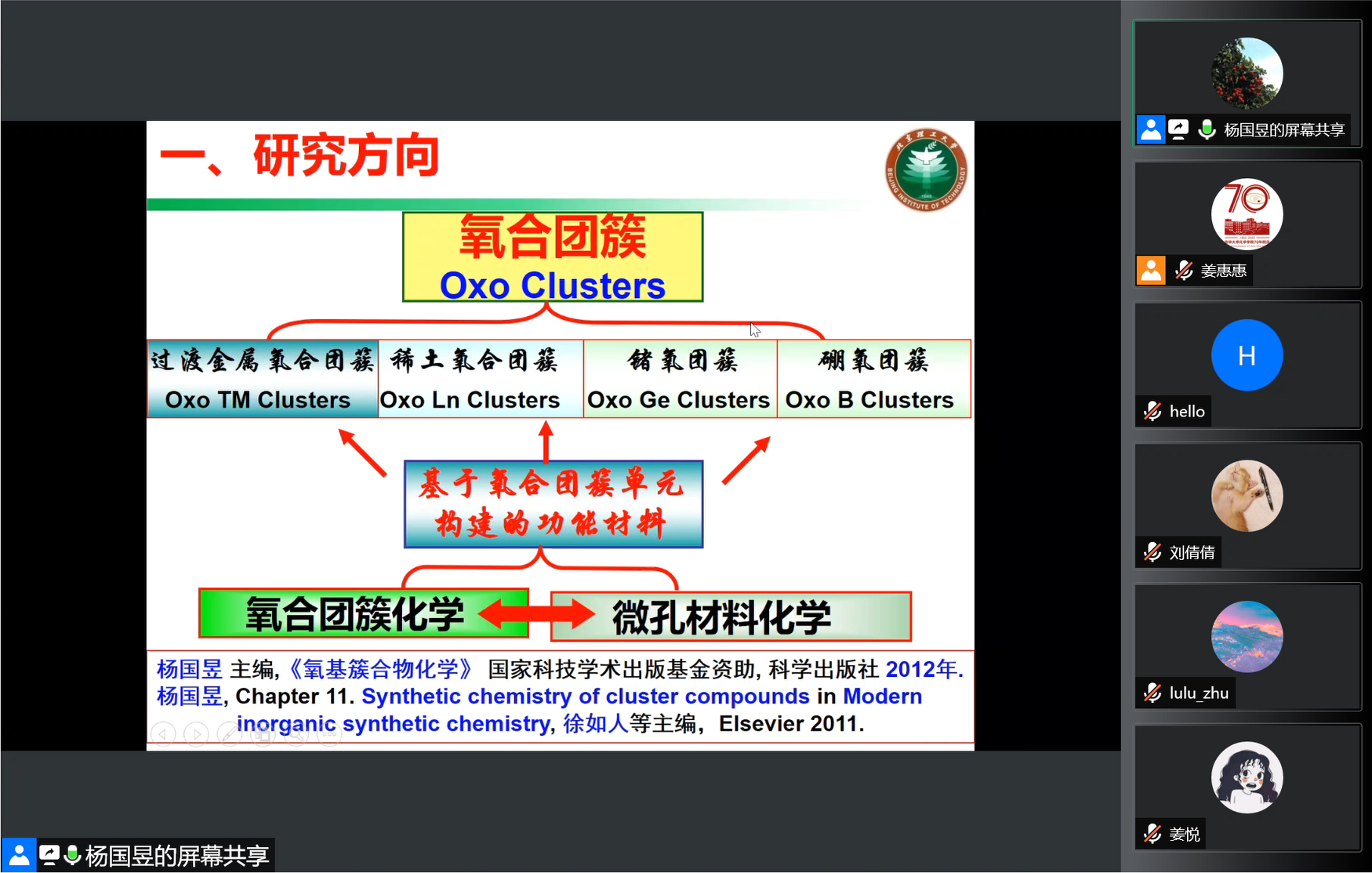 5月29日上午,北京理工大学教授,国家杰出青年科学基金获得者杨国昱应邀线上做客“吉大化学七十年——科学与未来系列讲座”,以“氧合团簇化学”为题,为公司师生作学术报告。
